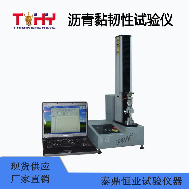 本仪器主件为粘韧性试验器、拉伸试验机和笔记本电脑。粘韧性试验器由拉伸半球圆头、定位螺母、定位支架、试样容器构成,其材料、结构、规格完全符合T0624-2011《沥青黏韧性试验》和SH/T0735-2003《沥青粘韧性试验法》标准规定的要求。拉伸试验机则备有固定粘韧性试验器的上下夹具,能以500mm/min速度等速拉伸,最大拉伸长度610mm。PC机则应用本公司自主研发的试验检测软件,实现试验的智能化和自动化。