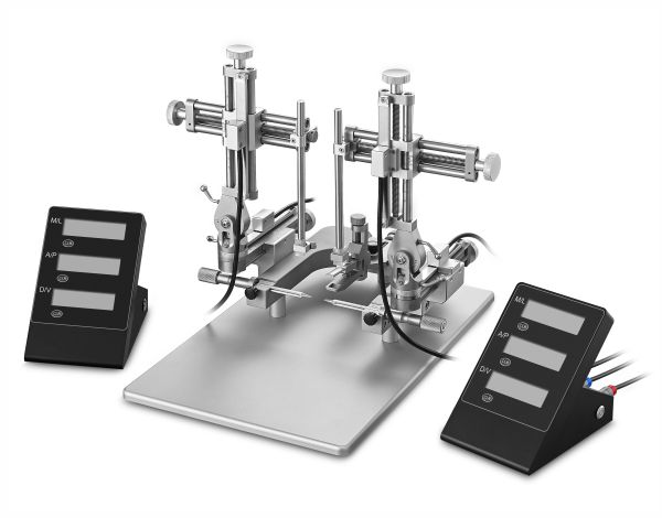 双臂数显脑立体定位仪是我公司又一创新产品,精度可到达0.01mm,是传统定位仪精度的10倍,是神经解剖、神经生理、神经药理等领域内的重要研究设备, 用于完成对神经结构进行定向的注射、刺激、破坏、引导电位等操作,可用于帕金森氏病动物模型建立、癫痫动物模型建立、脑内肿瘤模型建立、学习记忆、脑内神经干细胞移植、脑缺血等研究。     根据国内多位神经科学研究领域专家的建议并参考国外多种同类产品的性能特点, 该系列产品采取通用的U形底座开放式结构,方便进行多角度的操作;可适用于多种动物实验(大鼠、小鼠、蜥蜴、小鸟、猫及豚鼠等);可垂直方向180度旋转、水平方向360度旋转的操作臂为研究人员提供灵活、精确的定位; 还配有各种规格的探针、电极固定夹持器,并可以根据用户的不同实验要求提供定制的固定夹持器以满足各种实验要求。
