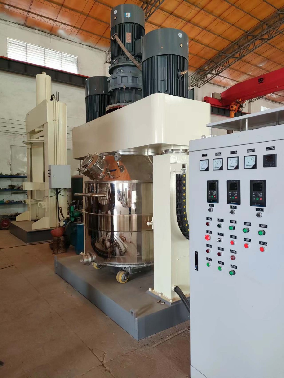 一、强力分散机介绍: 强力分散机适用于有机硅胶、玻璃胶、油墨、免钉胶、植筋胶、密封胶、电子硅胶、硅酮密封胶,硅酮结构胶,黑胶,耐候胶,防酶玻璃胶,幕墙胶,免垫胶,美缝剂,植筋胶,真瓷胶等实验与生产,搅拌机的设计形式一般有龙门式、平台式;平台式多用于实验,前者为生产型。在这几种形式中使用广泛为龙门式,多数用在硅酮密封胶行业里,新能源行业为龙门提缸式。平台式的容量为5L,多数用于做实验与新产品的研发,深受各大研究院、公司单位与工程师的喜爱,是生产高产品的上上之选。 二、设计结构参数: 整套设备:含分散机、液压出料机、两个料缸、真空系统、控制系统 设计容积:常规5L、100L、300L、600L、1100L、2000L、4000L、5000L 设计温度:常温 加热方式:夹套循环加热(加热介质:水/油) 设计压力:常压 承受压力:正压:0.1MPa,负压:-0.096MPa 设备材质:304不锈钢/306不锈钢/Q235碳钢 搅拌方式:高速分散+低速搅拌刮壁 电机功率:5.5KW-75WK 设计形式:龙门式提升密封罩、异形密封罩(可根据要求制定) 三、设备工作原理: 1.分散机装有低速搅拌部件和高速分散部件,低速搅拌部件采用行星齿轮传动,搅拌桨在公转时也自转,使物料上下及四周运动,从而在较短的时间内达到理想的混合效果。 2.分散机高速分散部件与行星架一起公转,同时高速自转,使物料受到强烈的剪切与分散混合,其效果为普通混合机的几倍。分散部件分单分散轴和双分散轴,客户可根据需要选用。 3.分散机两个双框搅拌器在桶体同时公转并自转,可实现抽真空、加热、冷却、根据情况可实现转速调节,配多个搅拌桶可一机多桶操作,匹配压料机让出料更方便。 强力分散机优点: 1。360°无死角搅拌,均匀分散混合,搅拌轴2根低速、1根高速、1根刮边; 2.实心搅拌轴,专注高粘度搅拌; 3.料缸内部经大型立车加工,保证内部光洁度; 4、出料可由压料机挤出或高粘度泵抽出。 四、强力分散机应用领域: 分散机广泛用于固-液相、液-液相物料的均质搅拌、聚合反应、硫化、磺化、分散、溶解、调质等工艺过程。主要用于生产硅酮密封胶、硅酮结构胶、中性玻璃胶、中性防霉胶、中性耐候胶、硫化硅橡胶、电子硅胶、液态硅胶、电池浆料,导热硅脂,聚氨酯密封胶等等。 五、强力分散机操作说明: 设备按上升按钮,横竖上升到需要的高度即停,推入釜体锁稳固定,按下降按钮,横梁下降,浆轴离料缸口约50-100mm即停,确认料缸已安装到位,再点动横梁下降,待浆轴进入料缸后才下降,到位后碰到限位开关即停 ,此时密封盖上的硅胶条刚好压紧料缸口部。 通过变频器启动行星架低速浆轴及高速分散轴,从低速调到高速进行搅拌,根据生产工艺,可从各管口加入各种材料,适时启动真空泵进行真空下工作,停止工作时应从高速调到低速,后停止转动,打开真空阀放空才能升降横梁,拉出料缸才能进行下一轮工作。 六、安全注意事项: 1、工作前请检查各部位正常后才能投入使用,决不能设备带“病”工作; 2、搅拌的料缸中不能留下工具或者硬杂物避免损伤浆轴。 3、横梁下降时头和手不能伸入料缸口内。 4、浆轴不能在没有料缸中快速转动、高速分散轴决不能空车长时间内高速转动。 5、停止工作时应从高速缓慢调至低速,非紧急情况下不能乱用急停车。 6、抽真空时应待粉料与液体浸透后才进行,避免粉料吸入泵内而损坏。 7、工作结束时,把空料缸推入横梁下降至桨叶伸入料缸内然后切断电箱总电源。 |