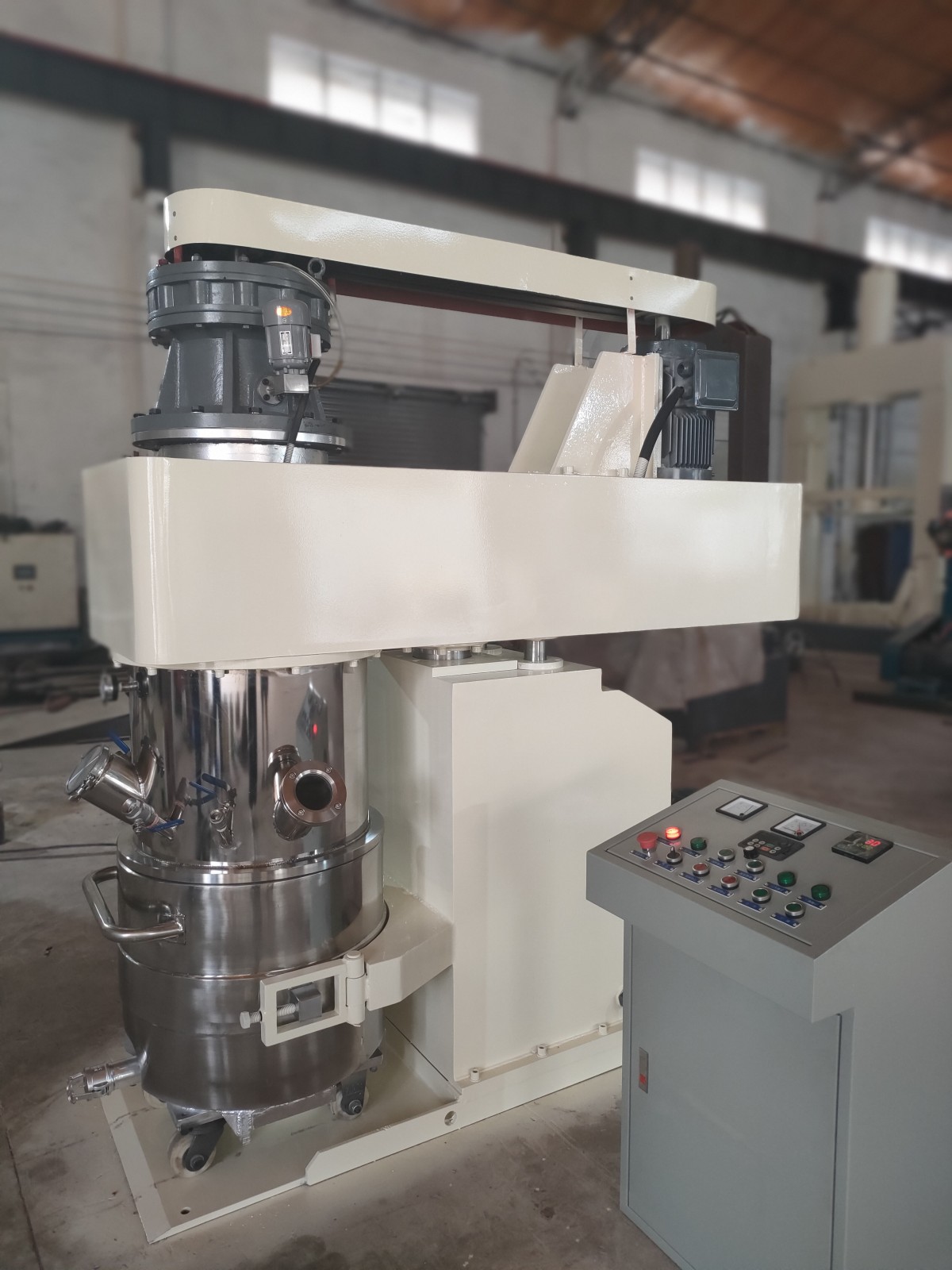 产品名:行星搅拌机 材质:304不锈钢、316不锈钢、Q235-B碳钢 容积:5L、20L、50L、100L、200L、300L、500L、1000L、2000L 浆叶:多层型、蝴蝶式、框式、叶轮式、麻花浆 压力:常压、-0.098MPa 电机:1.5KW-55kw(电机马达根据物料匹配) 转速:每分钟0-90转(无极变速) 结构:设备结构由电机、减速机、上梁、立柱、底座、密封罩、料筒、控制系统、液压系统九大部分组成 真空:设备可实现极限真空-0.1MPa,适用于多种生产工艺 运行:设备运行状态下,釜内有两根或三根多层浆叶搅拌器和一至两个自动刮刀,搅拌器在绕釜体轴线公转的同时,又以不同的转速绕自身轴线高速自转,使物料在釜体内作复杂的运动,受到强烈的剪切和搓合。此外设备内的刮壁刀绕釜体轴线转动,将粘在壁上之物料刮下参于混合,使其效果更为理想。 电柜:带电源指示灯、数显速度表与速度调节按钮,搅拌启动停止按钮,升降、急停按钮,射灯,真空装置,温度控制器、计时器等 精密:搅拌桨一次成型,桨与桨之间最小达2mm、桨与底部间隙为1-4mm、桨与桶壁之间2-5mm;桶体内壁车床精加工,再经大型抛光机自动抛光,确保桨上的活动刮刀在旋转时,把釜体内壁上的物料完全挂刮掉 优势:加工精度高,主轴采用高精度机械密封,轴承采用日本进口轴承;电机减速机采用,西门子-国茂等知名品牌,提高设备质量与安全性,节能,设备噪音小; 行星搅拌机优势: 1、结构先进、操作方便、运行安全可靠。 2、混合速度快,且质量均匀。行星搅拌机搅拌器公转和自转+刮板刮底,360度无死角搅拌范围,因而对高粘度密封胶、膏体料、填充料混合搅拌分散合适。 3、节能环保。 4、对高粘稠物料具有剪切撮合作用,对粘度高的物料具有物理升温作用,满足高温脱泡脱水、无需外置加热、节省耗电量。 5、使用范围广,粘度在100万pcs和固含量90%以下的大多数物料适用。 6、混合的制剂稳定,不发生分层及离析现象。 7、本机密封无尘,操作简单、维修方便、适用寿命长。 此外,还可根据用户要求制作。 采购须知:采购流程----技术沟通----设计方案----客户确定方案----签订订单----采购材料----制造--交付设备----安装调试----售后保障 |