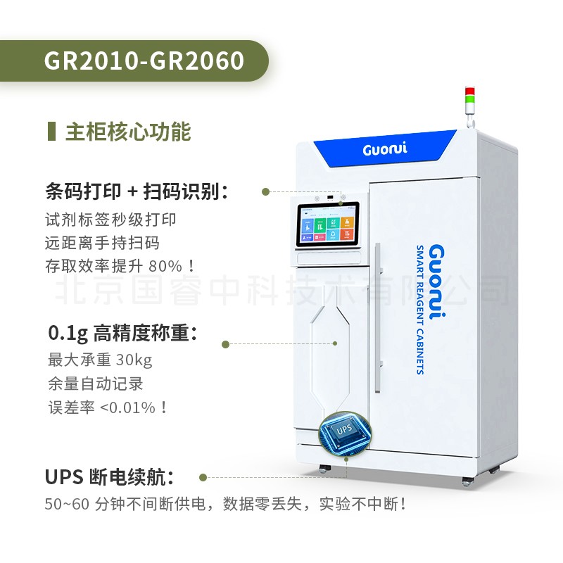 型号:GR2010智能信息化试剂管理柜 容积:420L 15.6英寸多点触控屏 7个存储单元,带防漏托盘,可拓展天平称重功能 网络连接,在线管理 柜体采用优质冷轧钢板全焊接工艺,PP防腐内腔、带漏液收集PP托盘