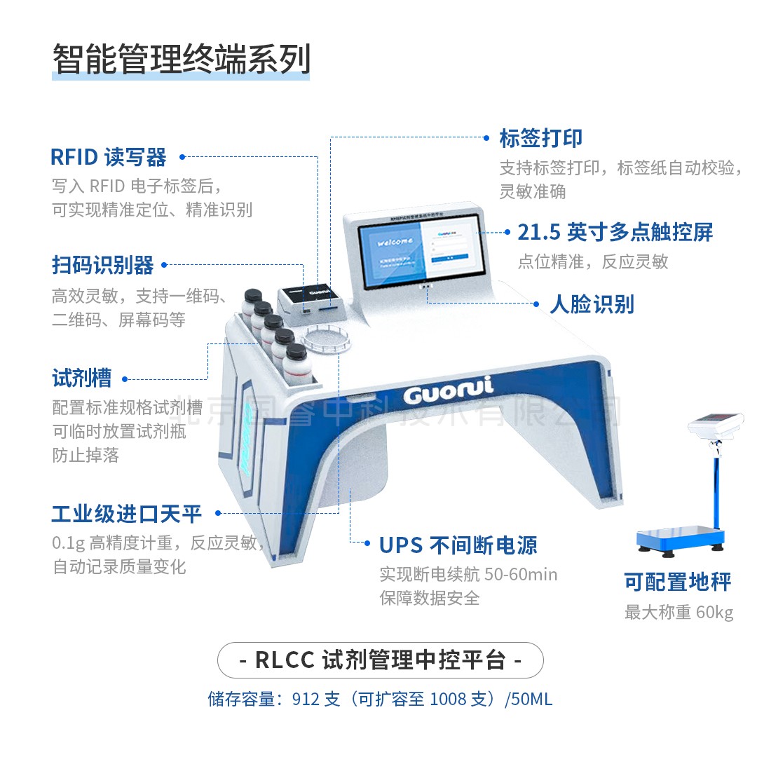 RLCC试剂管理系统中控平台集试剂管理软件系统、数据服务器、标签识别打印、RFID读写、人脸识别、UPS、智能称重等于一体,形成了一个控制中枢。对试剂库进行网络连接、组网管理,将试剂柜、智能柜、普通柜、货架等终端进行统一管理。