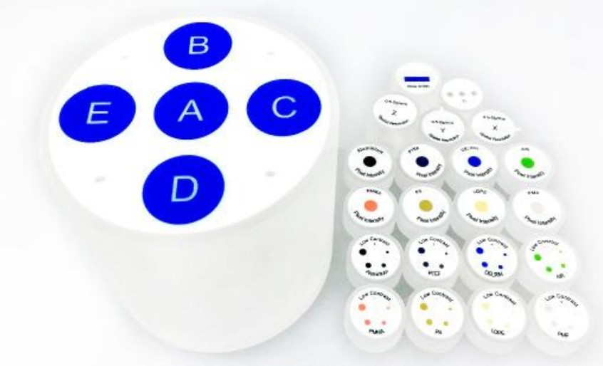 锥形束CT专用的性能检测模体 CBCT模体 DF-21 DF-21 为锥形束 CT 专用的性能检测模体。由深圳德方科技公司研发生产,完全满足 YY/T 0795-2022标准与T/WSJD 8 -2020标准与锥形束X射线计算机体层成像(CBCT)设备质量控制检测标准要求。 一次扫描可检测空间分辨率、低对比度分辨率、图像均匀性、体素大小、伪影、几何失真、测距等多项检测项目。 模体主体材料为 PMMA构成。模体为直径 160mm 圆柱体,圆柱体内具有 5 个直径 40mm 的腔室,分别为A,B,C ,D,E。每个腔室里可分别填充不同测试模块的圆柱形模块,模块可自行组合达到不同的检测要求。 应用标准: YY/T 0795-2022 口腔颌面锥形束计算机体层摄影设备专用技术条件 T/WSJD 8 -2020 口腔锥形束CT质量控制检测规范 WS XXXXX—XXXX 锥形束X射线计算机体层成像(CBCT)设备质量控制检测标准(WS专标,马上实施) 模体参数: 1. 模体材质:PMMA 直径 160mm,高度 170mm,内有 5 个腔室,可填充不同的模块,根据不同测试需求可自行排列组合。 2. 空间分辨率:1.0-5Lp/mm,分别有 X 轴,Y 轴,Z 轴三组。由铝和聚合物交替构成。线对分别为 1.0LP/mm、1.3LP/mm、 1.50LP/mm、1.70LP/mm、2.0LP/mm、2.50LP/mm、2.80LP/mm、3.50LP/mm、4.0LP/mm、5.0LP/mm。(可出具第三方计量检测报告) 3. 低对比度区域:每个测试模块都由 5 组不同直径 ( 直径分别为: 1.0, 2.0, 3.0, 4.0, 5.0) 的目标物质组成,目标物质共计8组分别为:铝、PTFE、 DELRIN、 LDPE、PMMA、PMP、空气 、聚苯乙烯、基底为 PMMA 材质。 4. 伪影:3 根 5.0mm 直径的钛棒。(可出具第三方计量检测报告) 5. 像素强度/HU 值:每个测试模块中心有10mm测试棒,共计8种材质:铝、PTFE、DELRIN、LDPE、PMMA、PMP、空气、聚苯乙烯、嵌在 PMMA 基底中,用于像素强度 /HU 值的检测。 6. 测距模块/几何失真模块:直径为1.0mm、深度为10.0mm的气隙阵列以10.0mm的间隔均匀分布在圆柱体的模块上。(可出具第三方计量检测报告) 7.图像均匀性模块:5组直径为40mm,厚度20mm的PMMA模块.与背景材料相同。 8. 其他圆柱模体由背景材料 PMMA 均匀组成。 9. 后续可添加具有CBCT功能的C形臂血管造影机与电子直线加速器中CBCT设备的模块。 |
