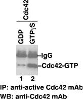 | 储存条件: Store at -20°C. Avoid repeated freezing and thawing | IP-蛋白质印迹:  IP/WB analysis of active Cdc42 protein. Purified recombinant Cdc42 proteins were loaded with GDP (lane 1) or GTPγS (lane 2). These proteins were immunoprecipitated with anti-Cdc42-GTP mouse monoclonal antibody (Cat. # 26905). After SDS/PAGE, the membrane filter was probed with anti-Cdc42 mouse monoclonal antibody (Cat. # 26008). | 免疫荧光: Immunofluorescent labeling of Cdc42-GTP in MS1 mouse endothelial cells. The MS1 cells cultured on glass coverslips (Fisher) in DMEM containing 5% FBS were fixed with 4% paraformaldehyde for 10 minutes at RT (room temperature) and permeabilized in PBSN (PBS+0.1%NP40) for 15 minutes at RT. The cells were stained with primary antibody (Cdc42-GTP) at 1: 25 dilution in Invitrogen’s CAS-BLOCK (00-8120) reagent at RT for 1 hour. After brief washing in PBSN (3x5min), a secondary Alexa555 conjugated goat anti mouse antibody (Invitrogen A21424) was applied in 1: 200 in CAS-BLOCK at RT for 1 hour. The coverslips were then washed in PBSN (3x5min) and mounted using vectorsheld’s hard set mounting medium (H-1500), and examined using a Zeiss inverted fluorescence microscope. |