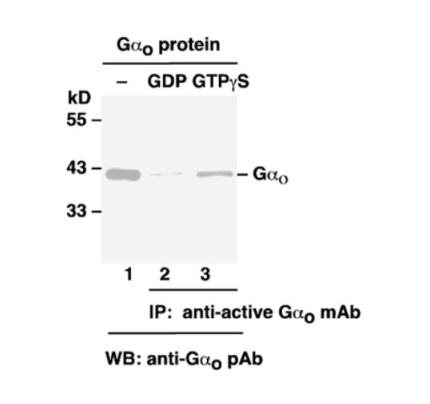 免疫沉淀/蛋白质印迹:  Gαo Activation Assay. Purified Gαo proteins were loaded as a control (lanes 1) or immunoprecipitated after treated with GDP (lane 2) or GTPγS (lane 3). Immunoprecipitation was done with the anti-active Gαo monoclonal antibody (Cat. No. 26907). Immunoblot was with an anti-Gαopolyclonal antibody (Cat. No. 21015).