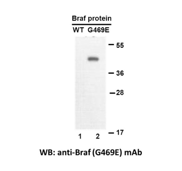 Western blot analysis of recombinant BRAF (G469E) and wildtype proteins. Purified His-tagged BRAF (G469E) protein (lane 2) and corresponding wildtype protein (lane 1) were blotted with Anti-BRAF(G469E) monoclonal antibody (cat. # 26196). 免疫荧光: