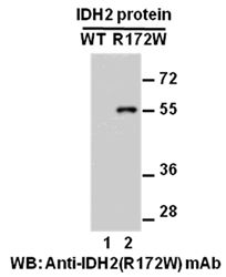 Western blot analysis of recombinant IDH2(R172W) and wildtype proteins. Purified His-tagged IDH2(R172W) (lane 2) and wildtype protein (lane 1) were blotted with anti IDH2(R172W) monoclonal antibody (Cat. #26164). 免疫荧光: