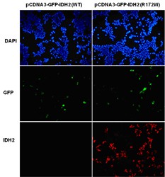 Immunofluorescence of cells expressing IDH2 proteins with anti IDH2(R172W) antibody. HEK293T cells were transfected with pCDNA3-GFP-IDH2 (WT) plasmid (left column) or pCDNA3-GFP-IDH2(R172W) plasmid (right column), then fixed and stained with anti-IDH2(R172W) monoclonal antibody (Cat. #26164). |