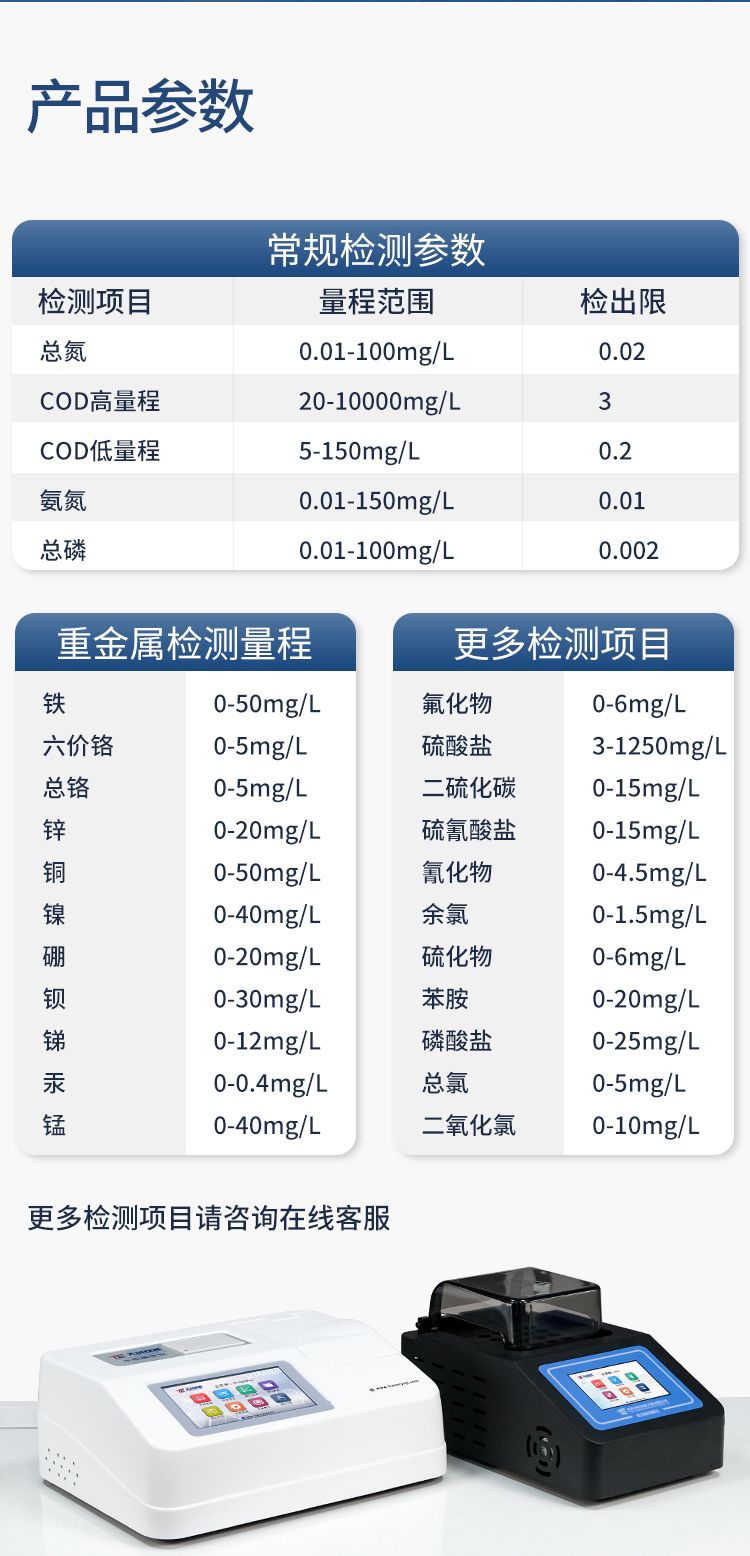 TE-5900Plus多参数水质综合测定仪采用彩色液晶触摸屏,光纤检测技术,进口光源,专业水质检测仪系统,运用人性化的操作界面指引设计,用户可根据文字语音提示操作仪器.检测方式采用1通道360°旋转式比色管检测系统、2通道自动比色皿检测结构.仪器性能稳定、测量准确、测定范围广、功能强大、操作简单.满足国标 《HJT399—2007水质化学需氧量的测定快速消解分光光度法》《HJ535-2009水质氨氮的测定纳氏试剂分光光度法》《GB11893-89水质总磷的测定钼酸铵分光光度法》检测要求.