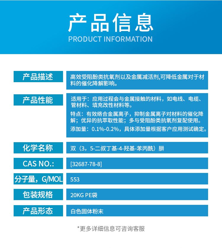 利安隆抗氧化剂 RIANOX® MD-1024 CAS No.: [32687-78-8] 双(3,5-二叔丁基-4-羟基-苯丙酰)肼 产品特点:有效络合金属离子,抑制金属离子对材料的催化降解;优异的抗萃取性能;多与受阻酚类抗氧剂复配使用。 分子量553 熔点(℃)221-232 堆积密度 kg/L1.11 产品形态白色-类白色粉末 包装规格20kg PE袋 适用于:应用过程会与金属接触的材料,如电线、电缆、管材料、填充改性材料等。 添加量:0.1%-0.2%,具体添加量根据客户应用测试确定。 |