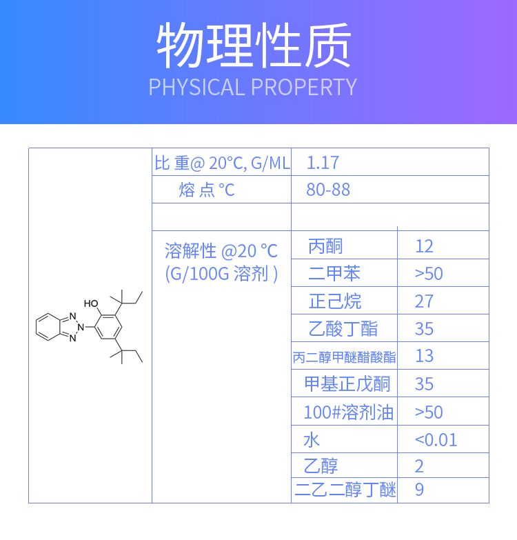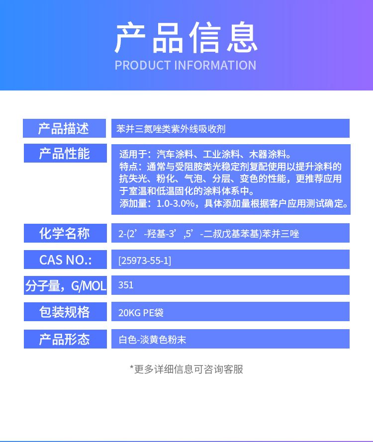 利安隆光稳定剂 RIASORB® UV-328 CAS No.: [25973-55-1] 2-(2'-羟基-3',5'-二叔戊基苯基)苯并三唑 光稳定剂UV-328的产品特点:通常与受阻胺类光稳定剂复配使用以提升涂料的抗失光、粉化、气泡、分层、变色的性能,更推荐应用于室温和低温固化的涂料体系中。 分子量351 熔点(℃)80-88 比重@20℃, g/mL1.17 产品形态白色-淡黄色粉末 光稳定剂UV-328适用于:汽车涂料、工业涂料、木器涂料。 添加量:1.0-3.0%,具体添加量根据客户应用测试确定。