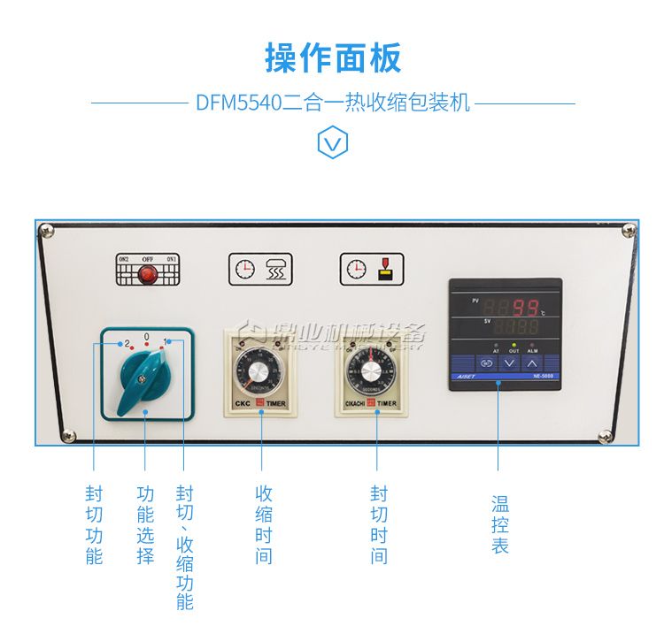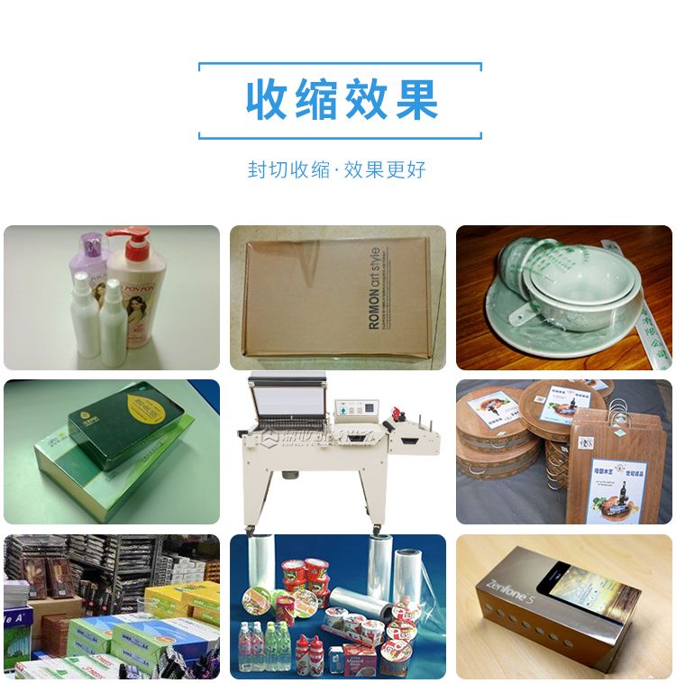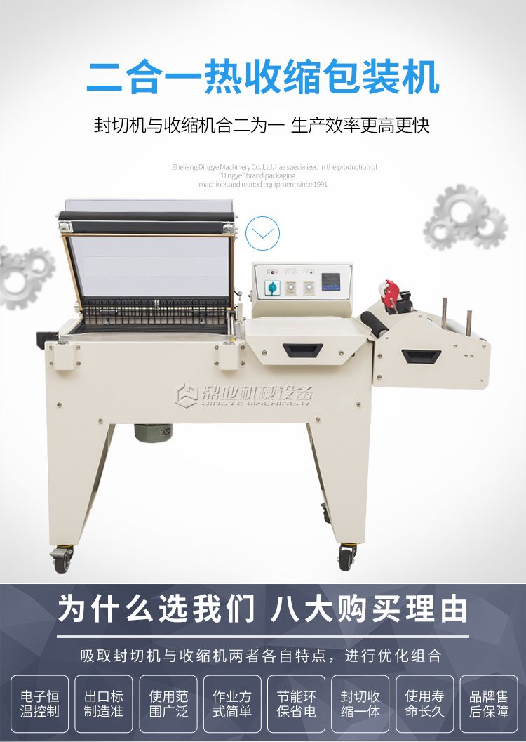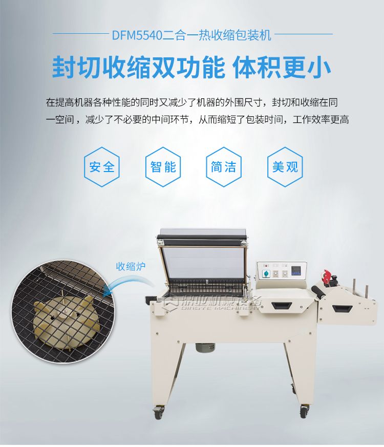 FM5540二合一热收缩包装机以POF、PP、PVC收缩膜为材料,集封口和收缩为一体,只须一个人工作便可完成封口和收缩作业,且降低了功率的消耗,广泛用于饮料、礼品、五金、化妆品、玩具及塑胶等外包装。