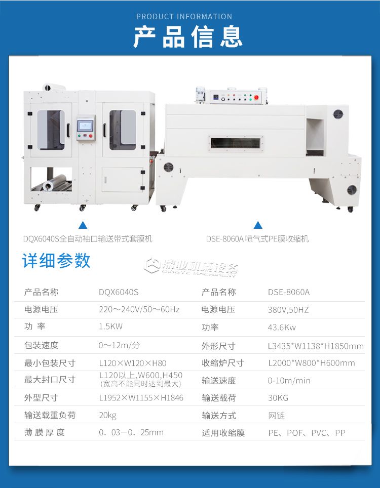 我对您的DQX6040S全自动袖口式输送带式套膜机+DSE-8060A喷气式pe膜热收缩包装机产品感兴趣,请发具体的信息及报价,谢谢!