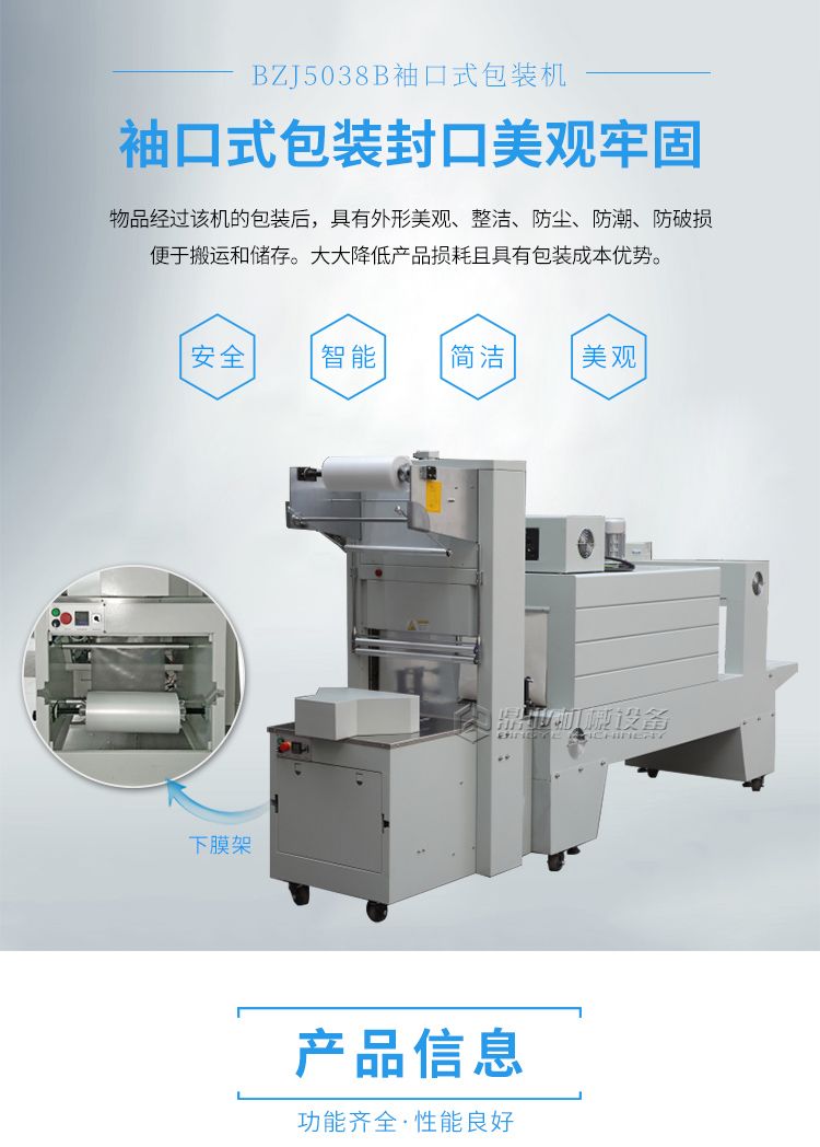 半自动袖口式套膜机适用于白酒、纯净水、可乐、易拉罐,矿泉水,啤酒,玻璃瓶,饮料等各种塑料瓶、玻璃瓶的无底托或有底托热收缩包装;同时与恒温PE收缩机配套使用,使物品达到**的包装效果;本机采用德国先进工艺,其主要配件均采用国外知名品牌;整机性能稳定,使用寿命长。 本机广泛应用于饮料、食品、电子、玩具、五金产品,化妆品、药品、书籍、电子等产品,包装后的产品外形美观、整洁、防尘、防潮、防破损、便于搬运和储存、大大降低产品的损耗,且成本低廉。