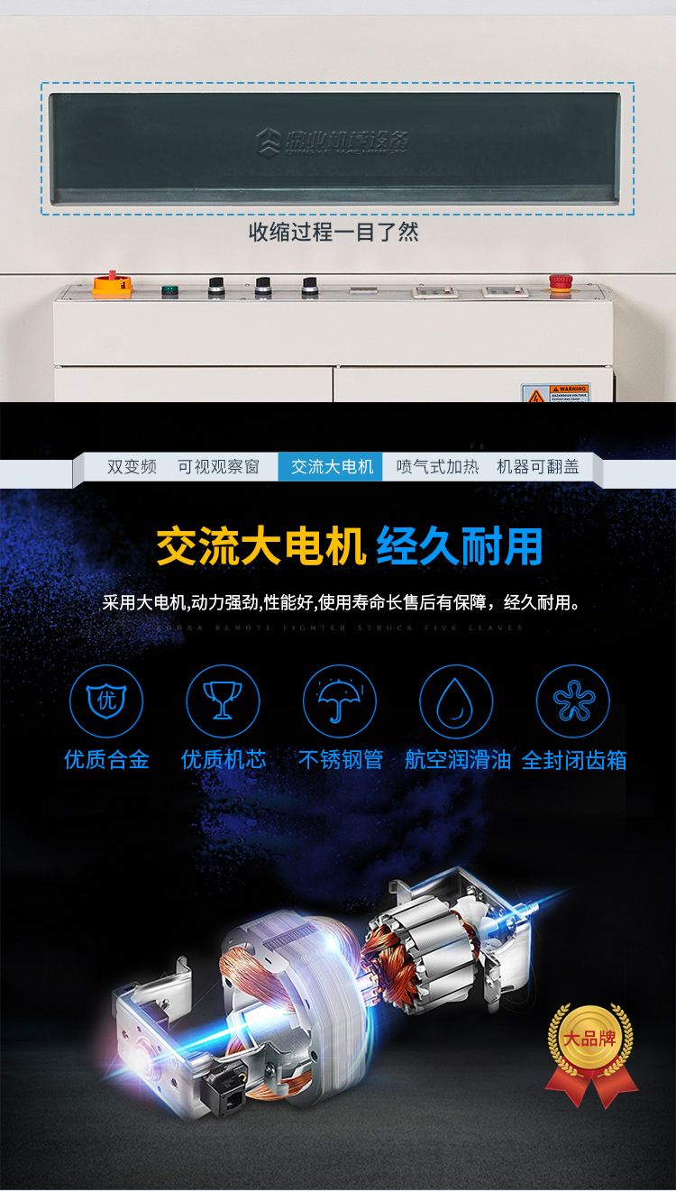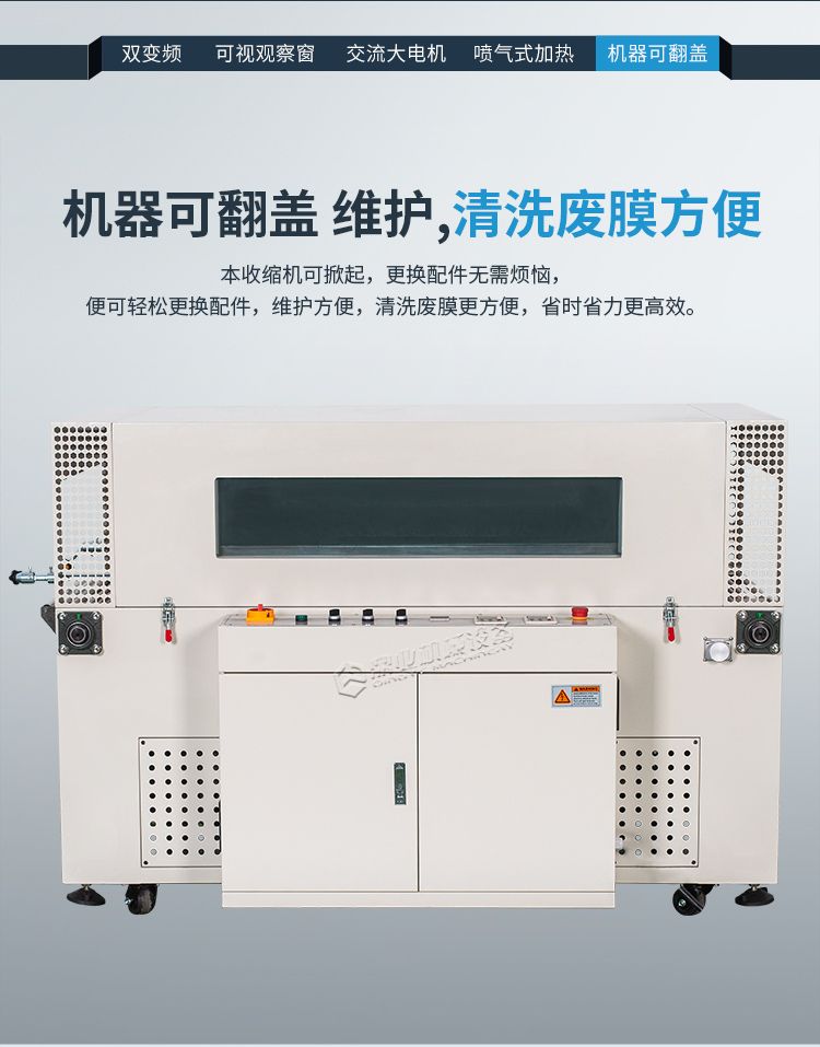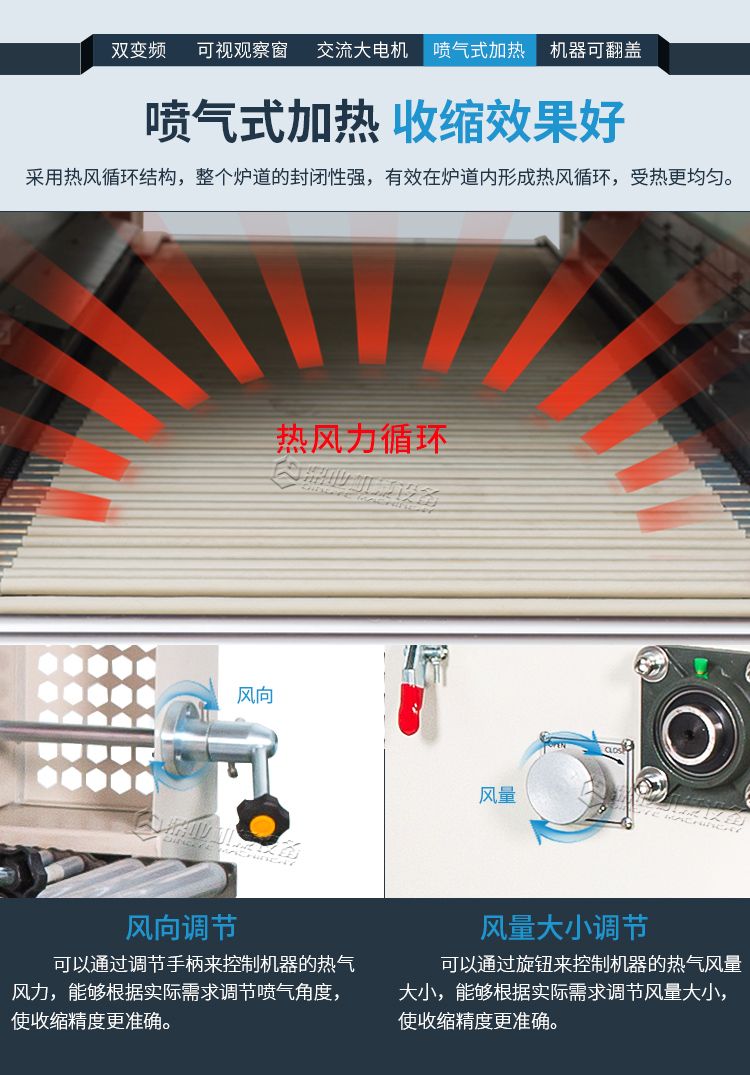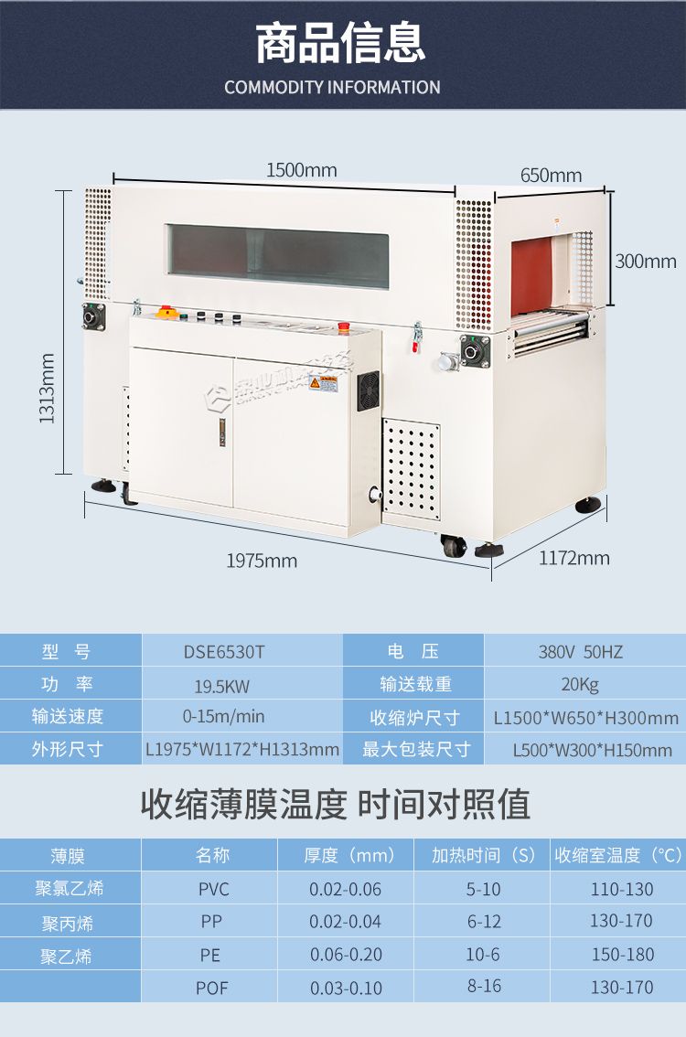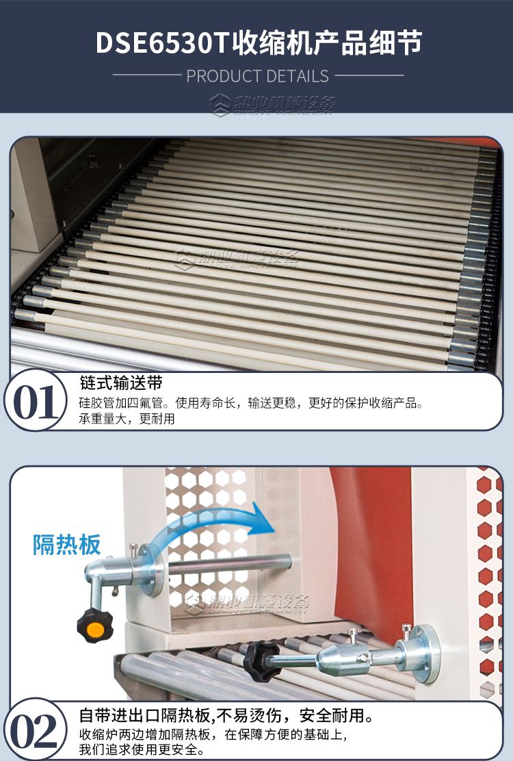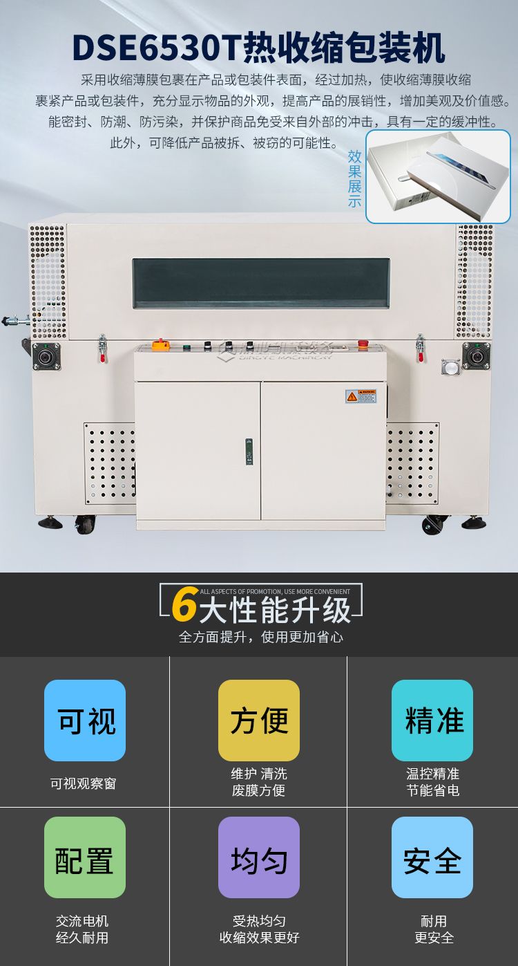 鼎业DSE6530T高配双变频调速可视观察窗风向风量可调薄膜热收缩机,采用收缩膜包裹在产品或包装件外边,经过加热使收缩薄膜裹紧产品或包装件,充分显示物品外观、提高产品的展销性、增加美观及价值感。