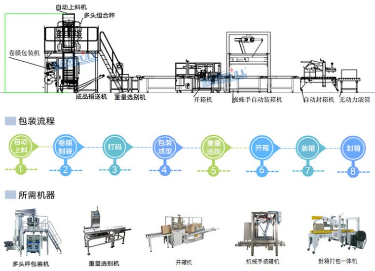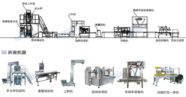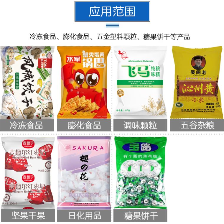 可适用于包装速冻果蔬、冷冻肉类、火锅食材、调料颗粒、糖果饼干、坚果干果、膨化食品等颗粒/块状类产品的包装。