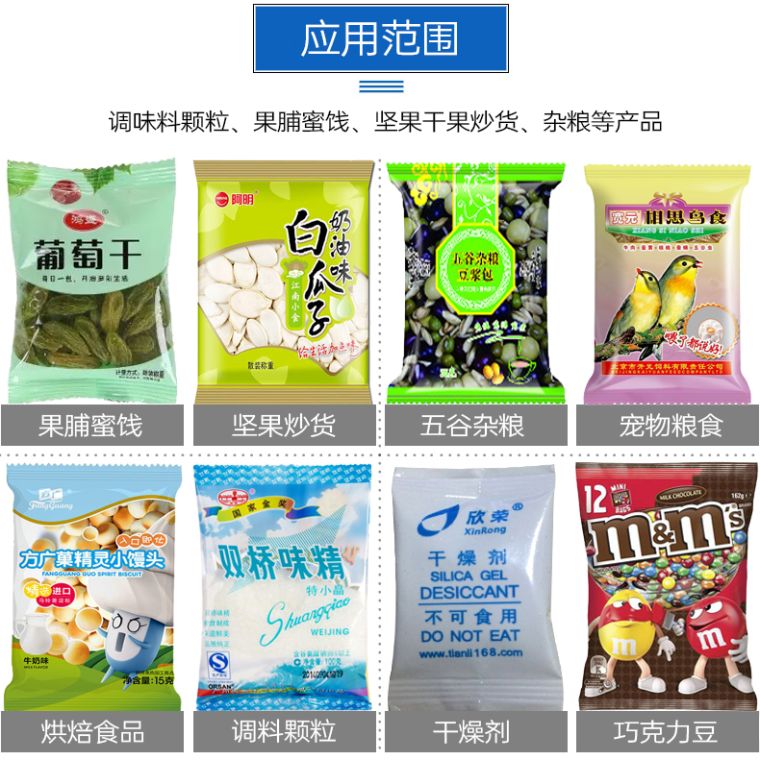 可适用于包装果脯蜜饯、花生瓜子、糖果饼干、五谷杂粮、调料颗粒等小颗粒类产品的小包装。