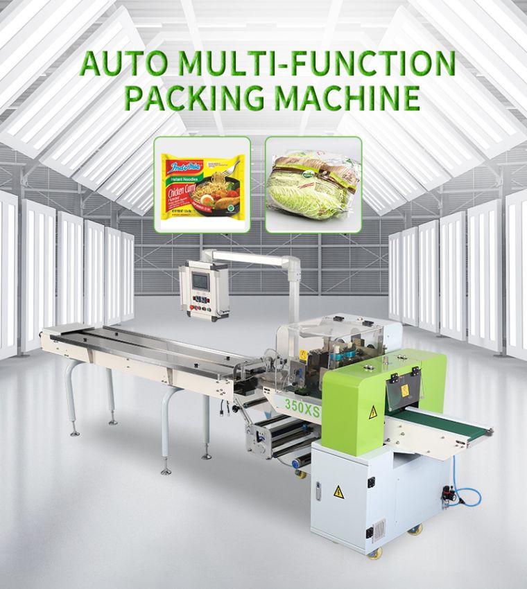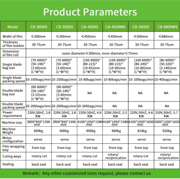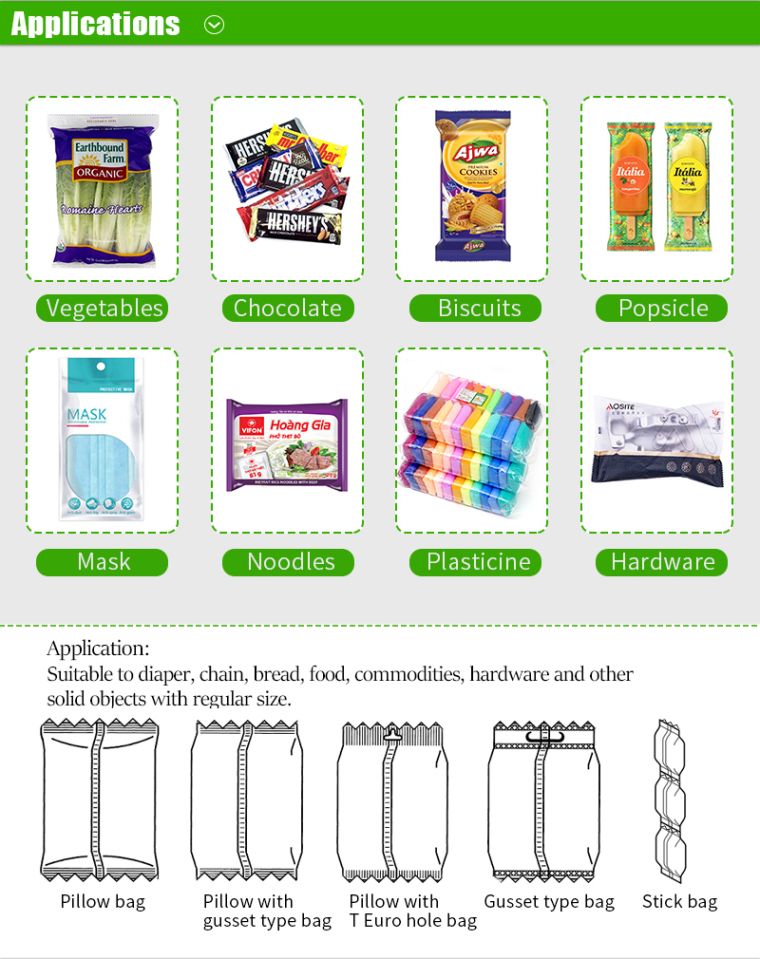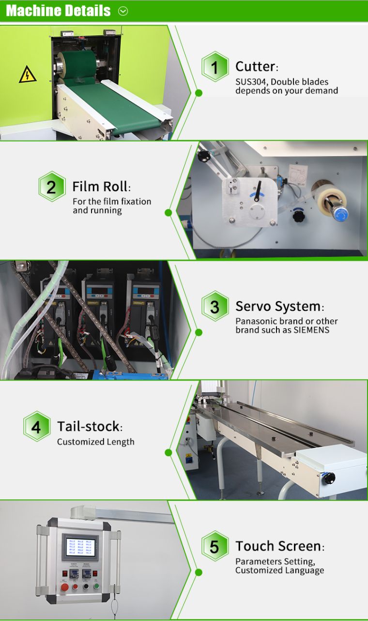 Installation 1)Use two M10x25 bolt、M10 nut to fix the tail frame and the main machine. 2)The chain must through the chain wheel, lock two end with chain lock when install the chain. Usage and features a) This machine suitable to be used in solid ®ular products. Food: instant noodle, biscuit, bread, chocolate, jelly, candy, popsicle, etc Industrial products: adhesive tape, soap, leechdom, box, tray, hotel article etc. Hotel article for use: paper、knife and fork、brush for shoe leather、toothbrush and toothpaste. Steel tube aluminum tube extrusion and so on six meters of strip products Outstanding FeaturesProduct specification technical parameter Output | Up to 200 products per minute Up to 40 m/min film speed Product and film characteristic may affect machine output | Size Range | Package cut-off length | 50-6000mm | Product width | max.140mm | Product height | max.60mm | Packaging Material Reel | Reel diameter | ≤300mm | Core diameter | ≤75mm | Packaging material width | max.300mm | Weight | max. 25KG | Connections | Voltage | 220V,50HZ | Power usage | 3KW | Machine weight | 600kg | Machine dimensions | L3900mm*W850mm*H1500mm | Blade cut type | Rotary cutter | Motor configuration | Dual servo | Optional Device | date printer, auto feeder, gas charger, etc. |