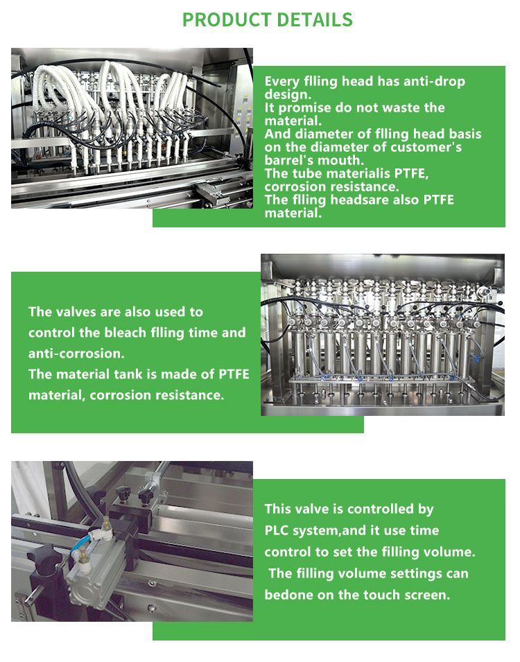 Outstanding FeaturesFilling capacity (ML): 100-1000ml Filling speed (BPM): 16-24 bottles per minute Power (VAC): 220V Motor power (KW): 2.0 Air consumption (MIN): 4KGS×30LITER Dimensions: 2000x1300x2100 Weight (KG): 2100 Specification