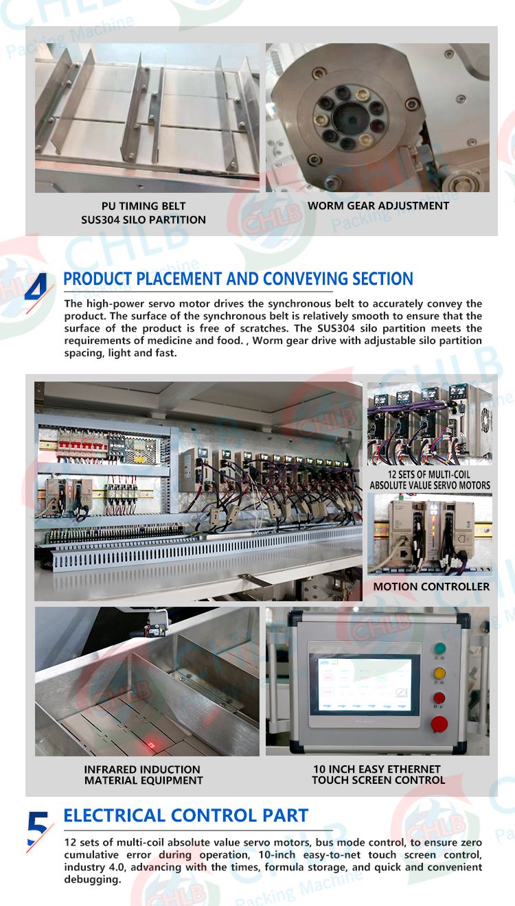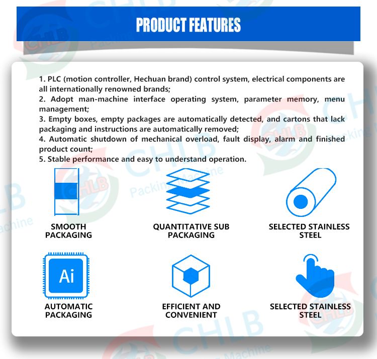 Description1. PLC (motion controller, Hechuan brand) control system, electrical components are all internationally renowned brands; Outstanding FeaturesThe main technical parametersCartoning speed: 60-100 boxes/min Quality requirements: 250-450g/㎡ (depending on the size of the carton) Size range: (80-210)mm*(35-110)mm*(20-60)mm, special size can be customized Compressed air working pressure: ≧0.6mpa Air consumption: 20L/min Power supply: AC380V /50Hz Motor power: 15KW Dimensions: (L x W x H) 4800mm x 1650mm x 2200mm Machine weight: 2000KG Specification