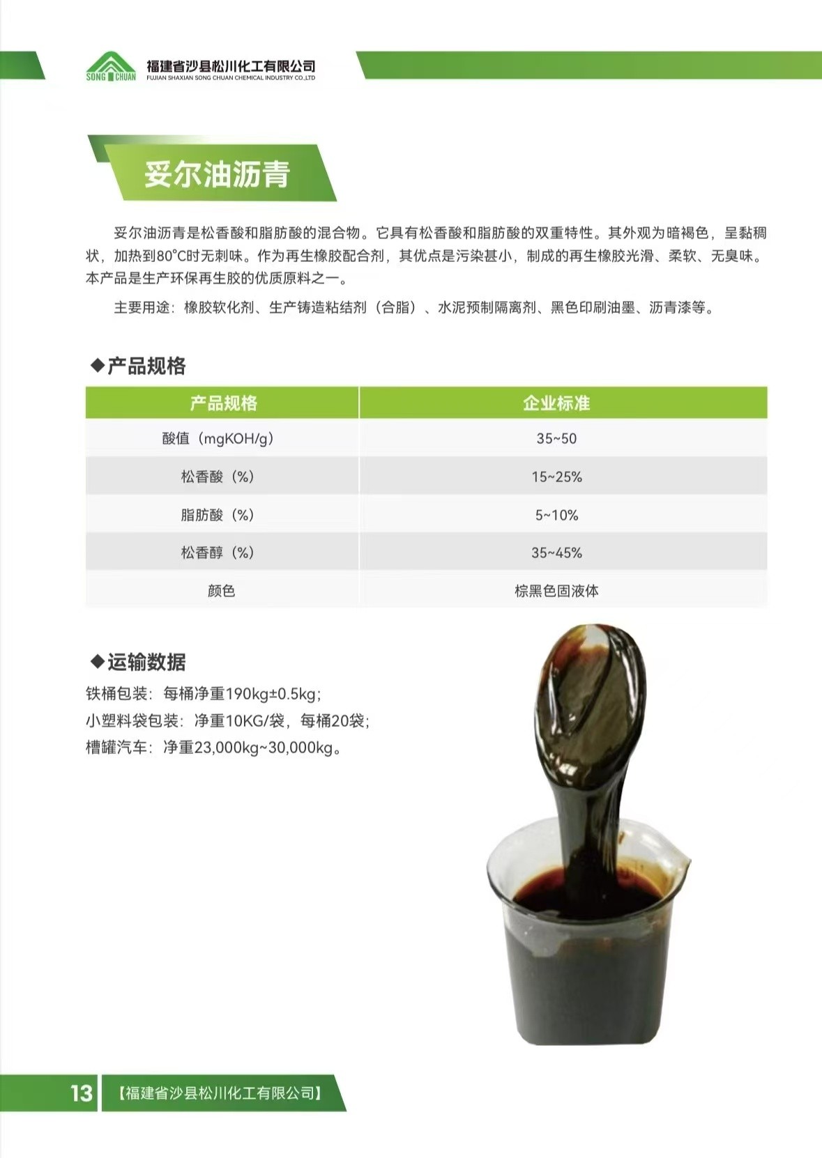 妥尔油沥青 TALL OIL PITCH SAS:8016-81-7 妥尔油沥青(环保妥尔油)是以粗妥尔油为主原料,经去水蒸馏除味配制而成。其外观为暗褐色,呈粘稠状,加热至80℃时无刺味。作为再生橡胶配合剂,其优点是污染甚小,制成的再生橡胶光滑、柔软、无臭味。本产品是生产环保再生胶的**原料,可用于生产铸造粘结剂(合脂),橡胶软化剂,其被广泛用作乳化剂增加丁苯橡胶(SBR)的流动性。也可应用于矿石浮选剂、生产铸造粘结剂(合脂)、橡胶软化剂、水泥预制隔离剂、沥青漆等领域。