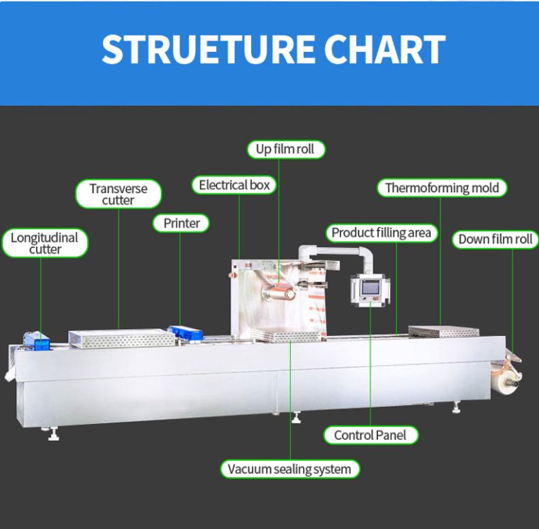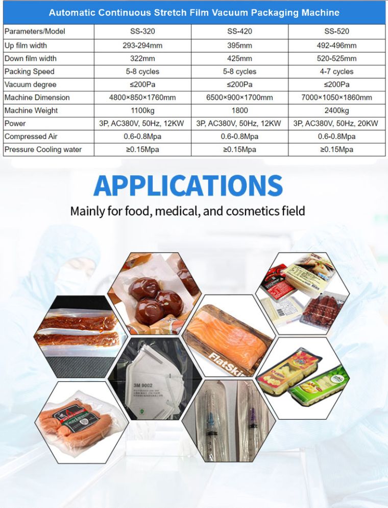 DescriptionAutomatic stretch film vacuum packaging machine Suitable for vacuum, aeration, skin packaging, etc. of various food, meat products, donkey-hide jujube series products, seafood, fruits and vegetables, pickles, frozen meat, medical products, hardware components, medical machinery, etc. It is controlled by Japan’s Mitsubishi programmable controller, 2310 color touch screen, Mitsubishi servo drive system is used, and all electrical appliances such as Japan, Europe, and Taiwan are used. Equipped with complete safety protection measures Outstanding Features