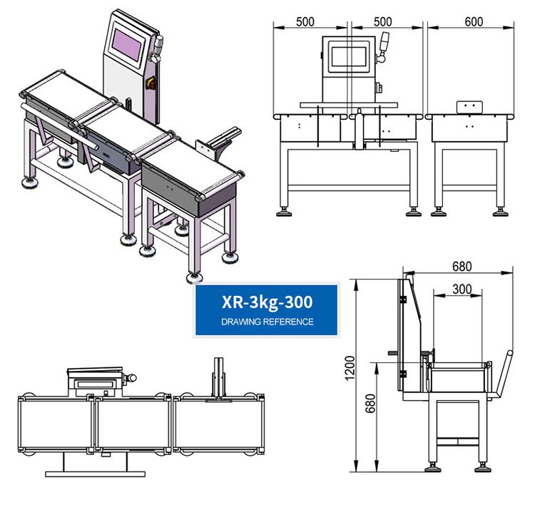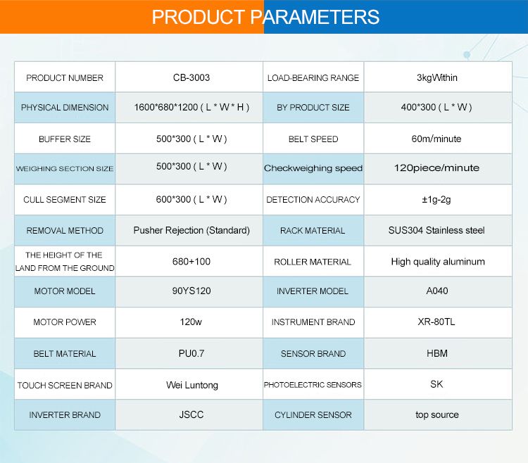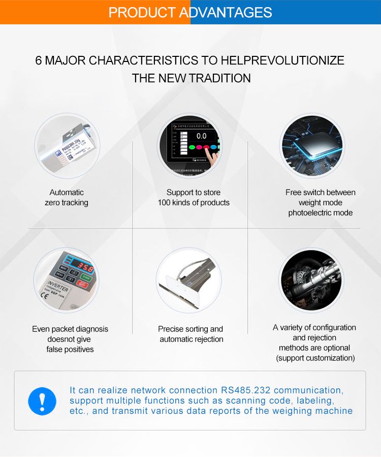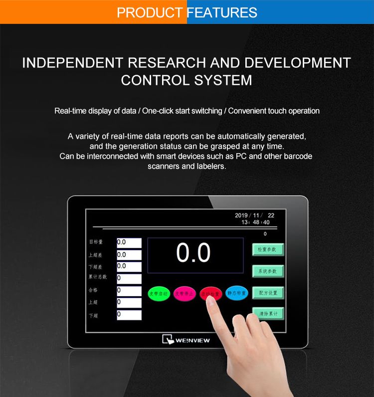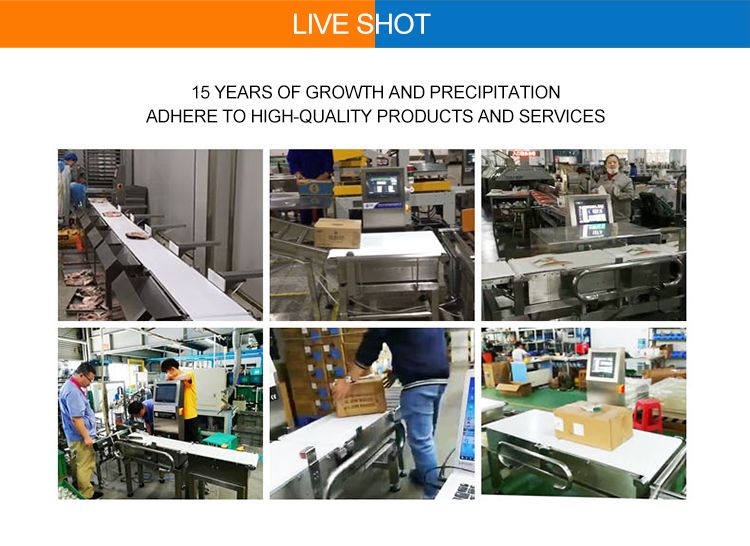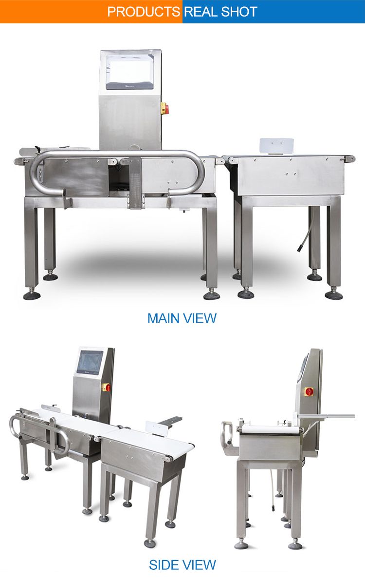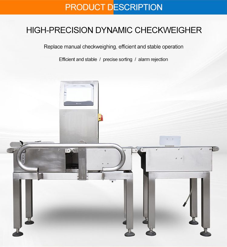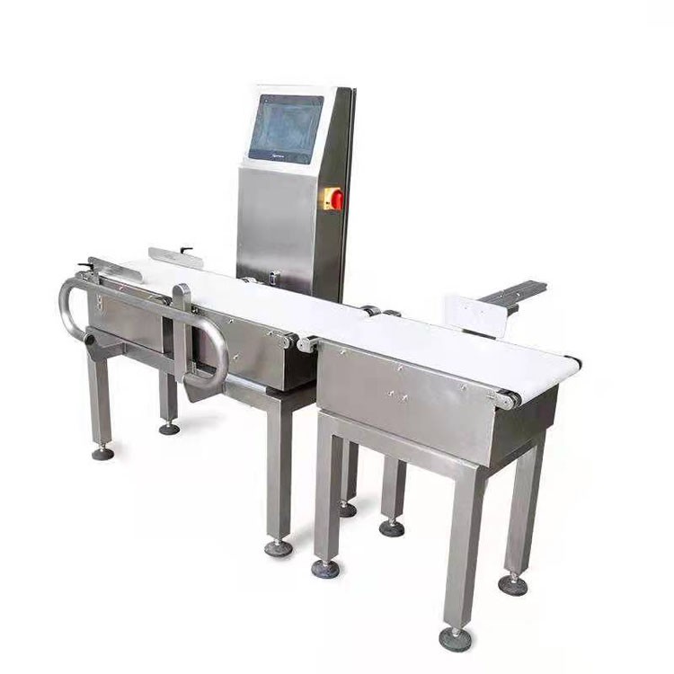 DescriptionAutomatic weighing machine Device parameters: Weighing range 10- 3Kg Weighing accuracy 0. 5- 1.5g Acceleration section size L500mm* W300mm Weighing section size L500mm* W300mm Rejection segment size L600mm* W300mm Display resolution 0.1g Sorting speed 10- 150 pieces/min Conveyor belt ground height: 700+ 50mm (can be customized) Conveying direction: left to right or right to left Motor power: AC220V 50/ 60HZ Operating temperature: 0°C to 40°C Working humidity: 90% relative humidity (no condensation) Scale body material: 304 stainless steel Outstanding Featuresautomatic weighing machine It is an automatic equipment that provides weight detection for food, pharmaceutical, electronics, beverages, health products, daily chemicals, light industry, agricultural and sideline products and other industries.