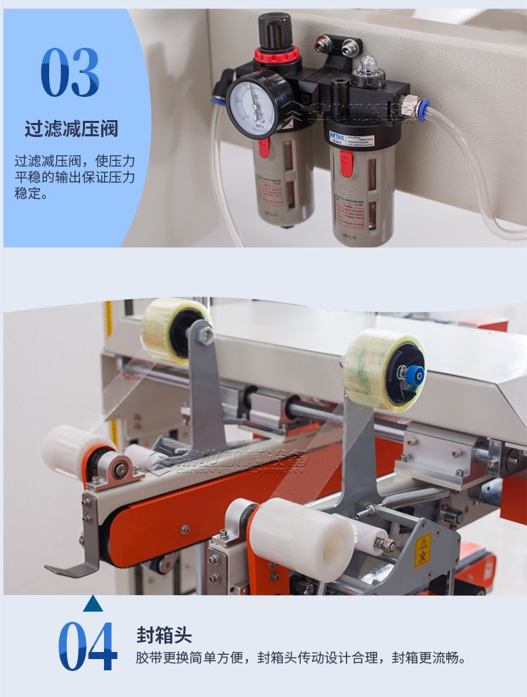 技术特点: 1、整机采用自动化系统,配有光电检测,具有自动唤醒,自动报警等功能,可以实现无人自动化运行 2、产品变换规格调整方便、操作容易简单 3、可与生产线直接联机使用 4、采用优质国际品牌电气元件,质量可靠 5、FXS5050四角边封箱机新型结构封箱头,封箱效果好,质量稳定,框架不易变形。使用时间长 6、整机结构牢固,各导向杆定位可靠,维护简单方便