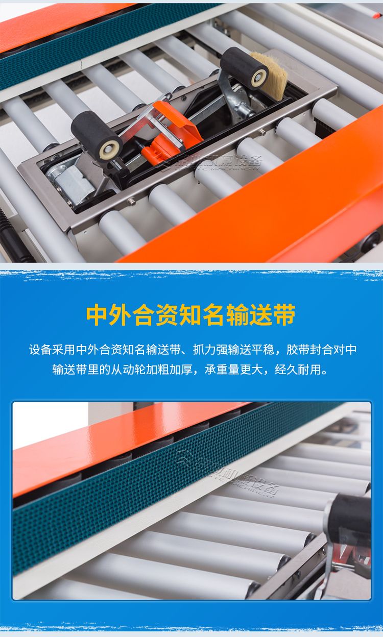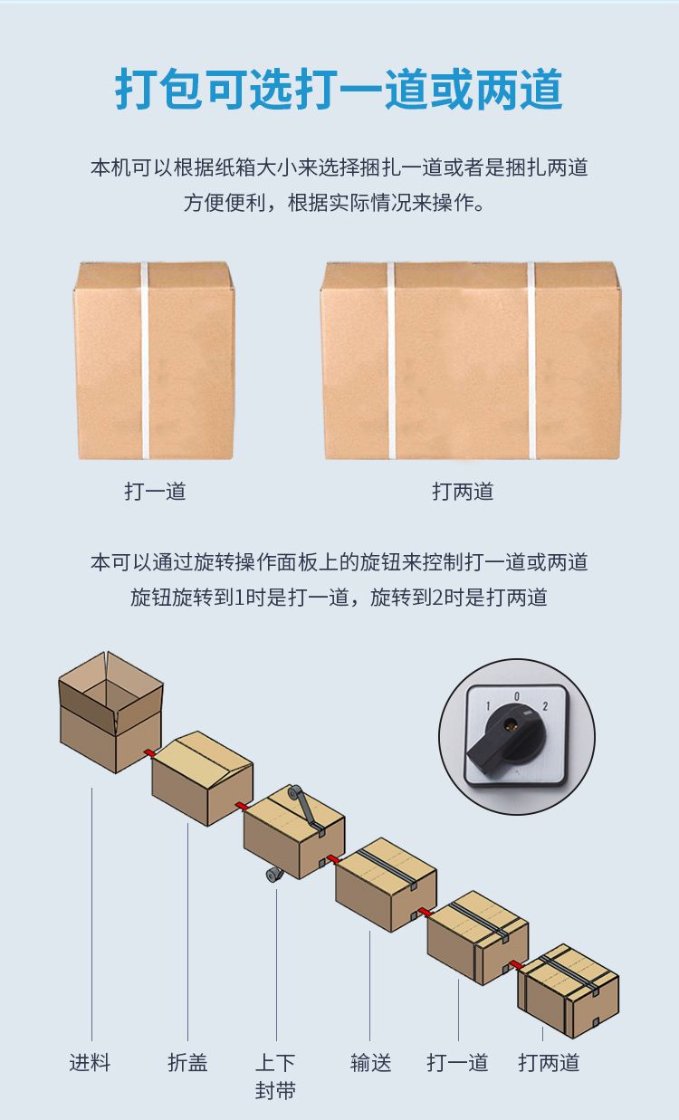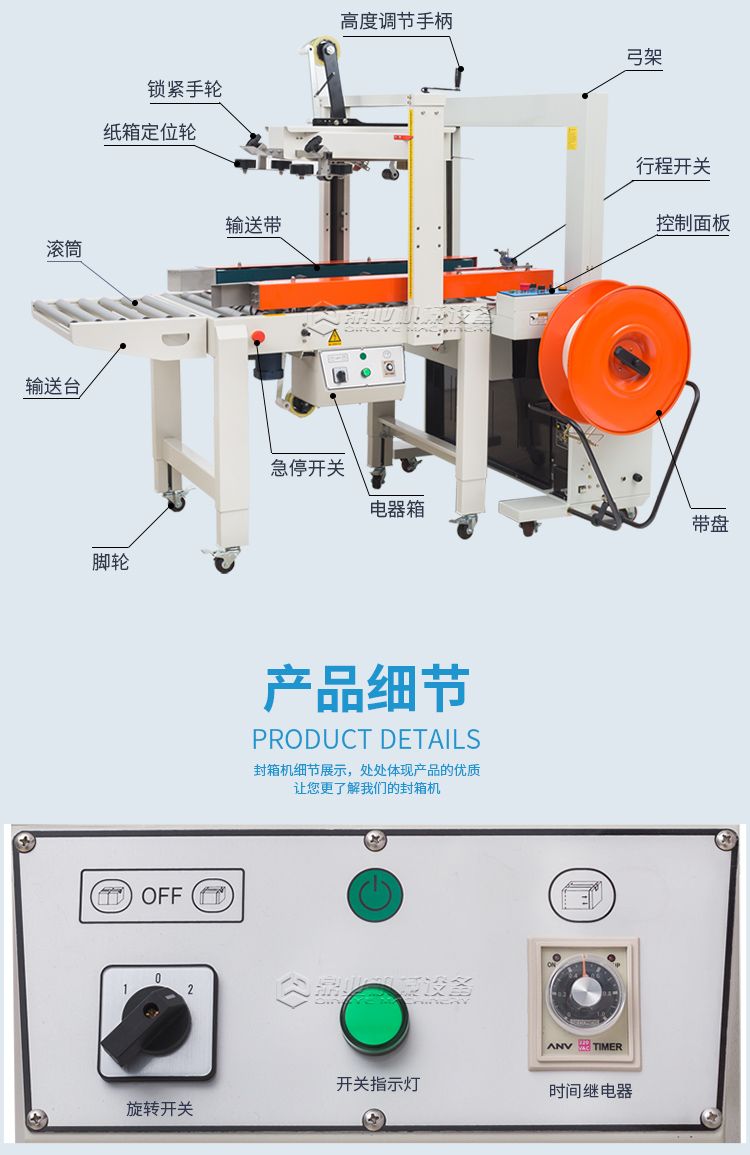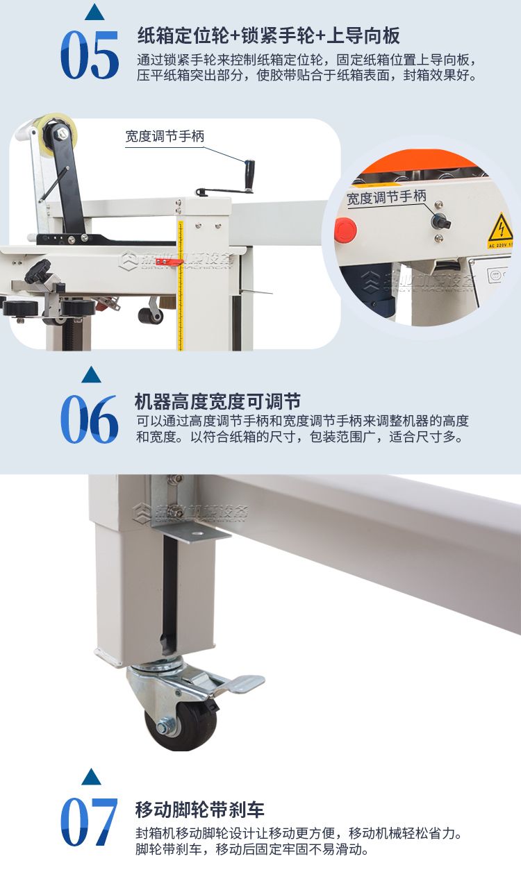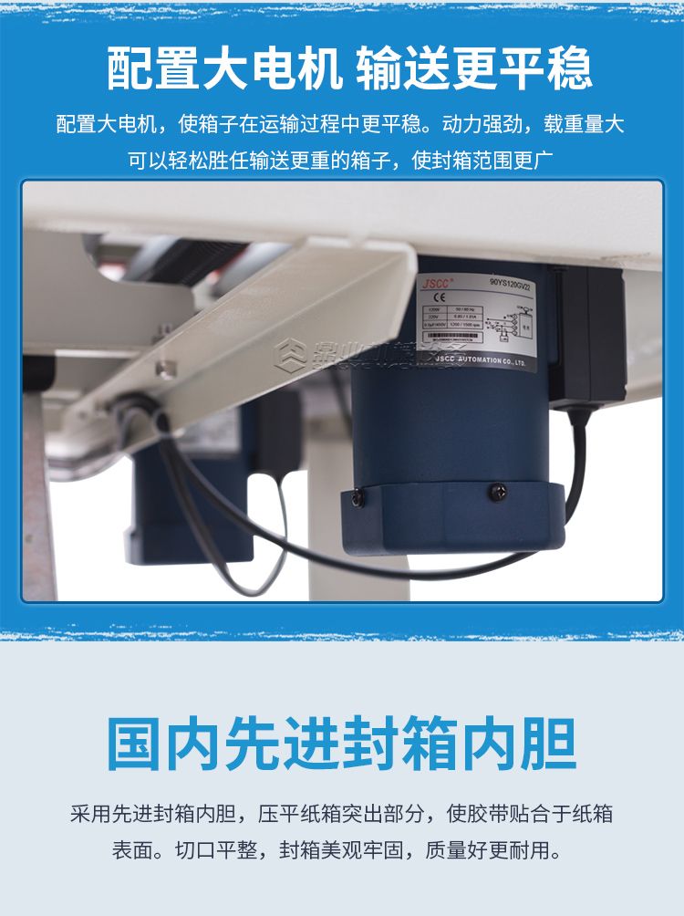 打包封箱一体机是以BOPP胶纸为封箱材料,可同时对纸箱进行上下“一”字型封箱,两侧马达驱动皮带自动校正、输送纸箱,封箱时快速平稳,适用于较重较宽纸箱。两侧辅助轮协助机器封箱时中缝集中不开裂。台面高度、纸箱宽度高度可自主调节,简单实用。造型典雅大方,配备刀片防护装置,避免操作时意外刺伤。机件稳固耐用,使用寿命长。机身自带四个高强度刹车轮,换位工作非常方便。