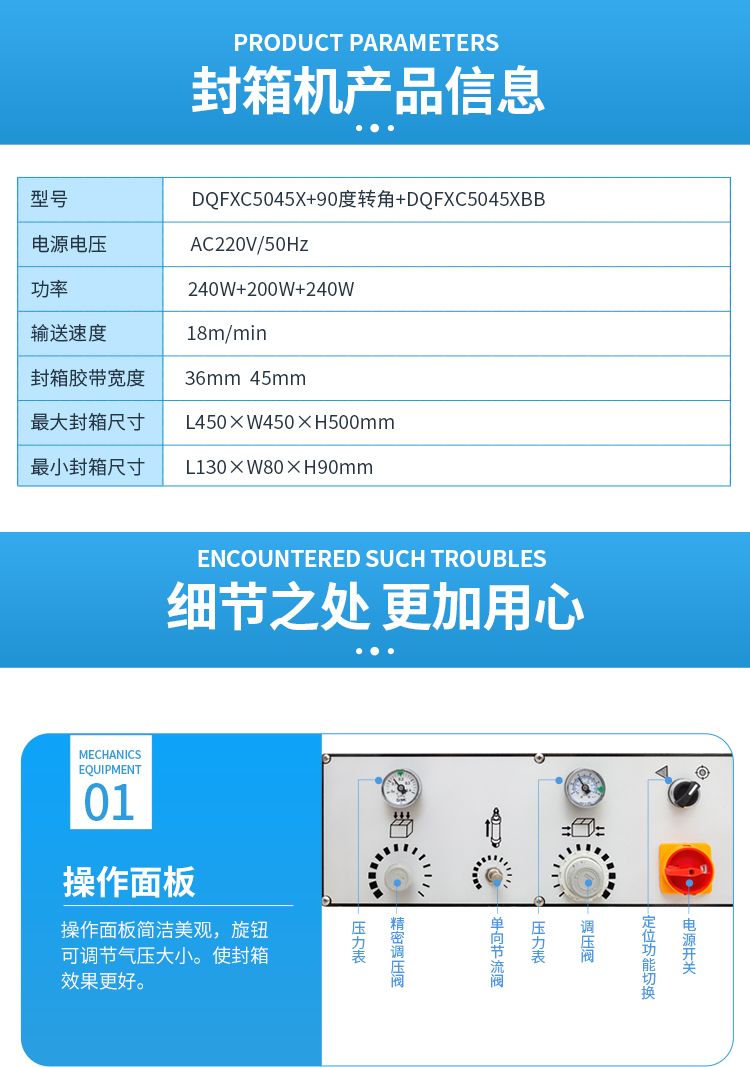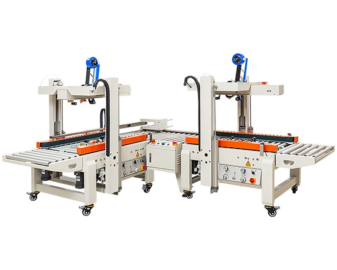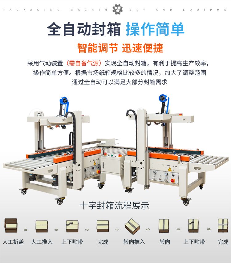 本款全自动封箱机组合,利用气动装置(需要自备气源),可自动调整宽度和高度来进行封箱,无需人工手动调整。邮政1-12号纸箱均可封箱,对尺寸大小不一样的纸箱可自动连续封箱,自动推箱进行十字封箱动作,生产效率更高.