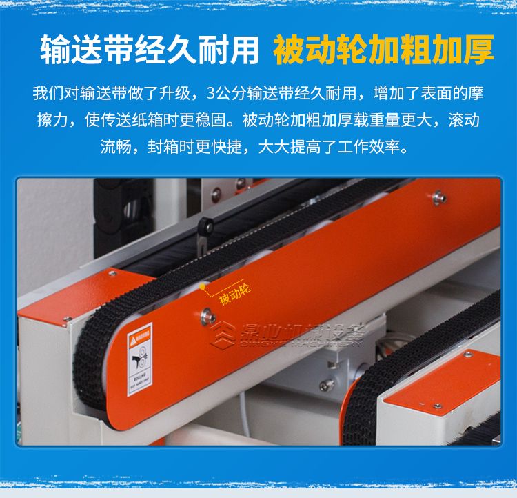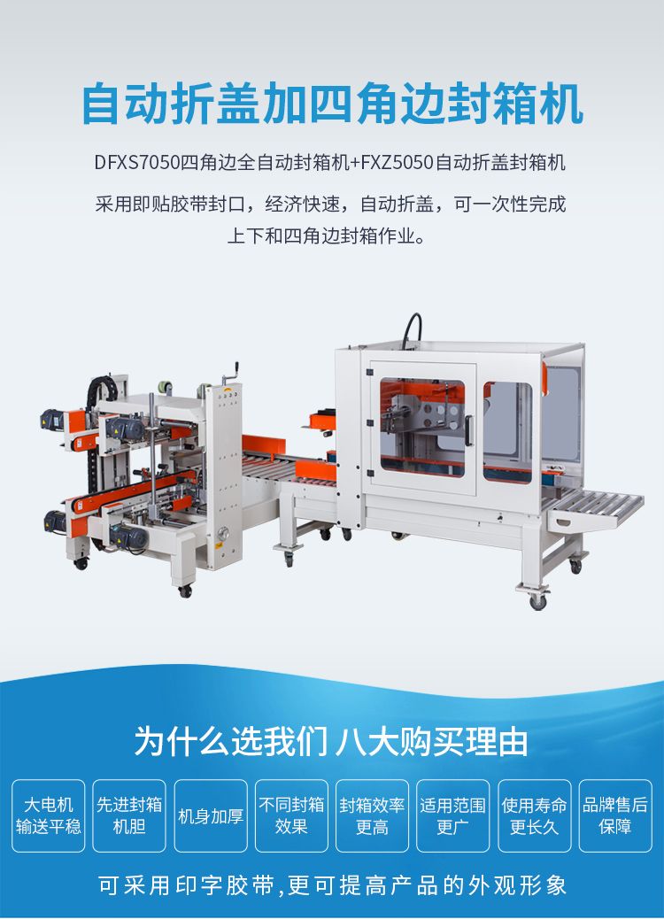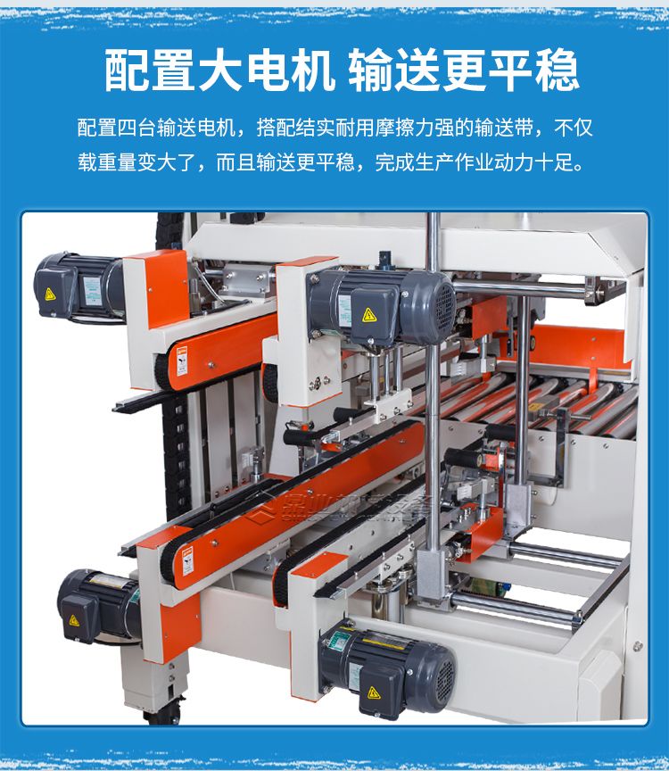 全自动四角边封箱机配置四台输送电机,搭配结实耐用的摩擦力强的输送带,不仅载重量变化大,而且输送更加平稳,完成生产作业动力十足。