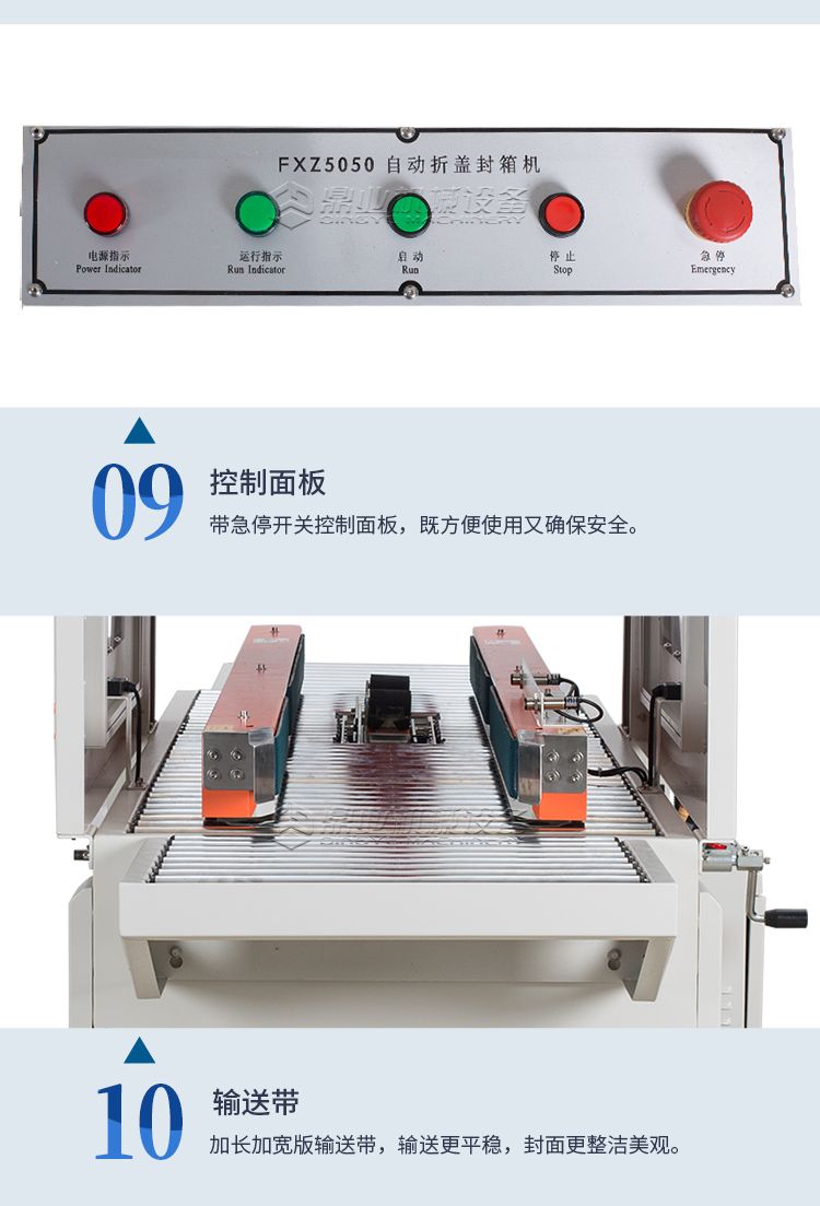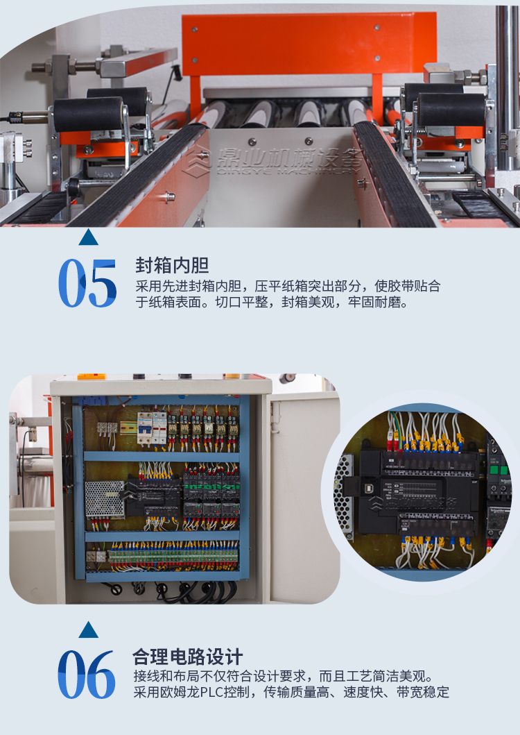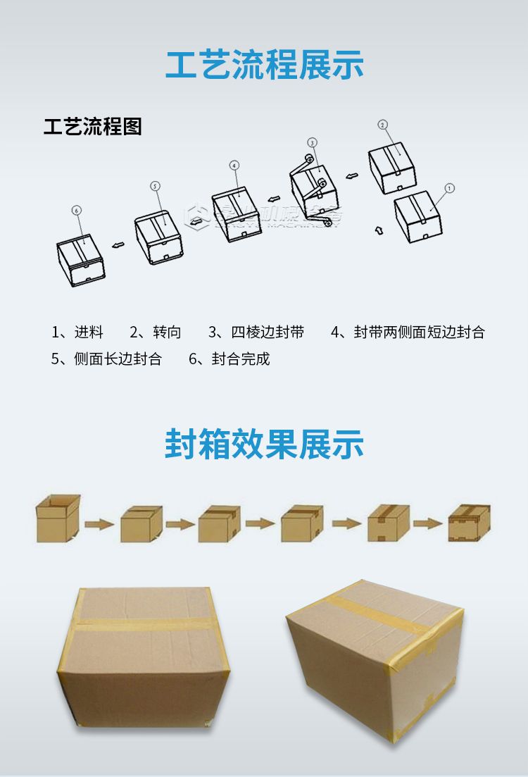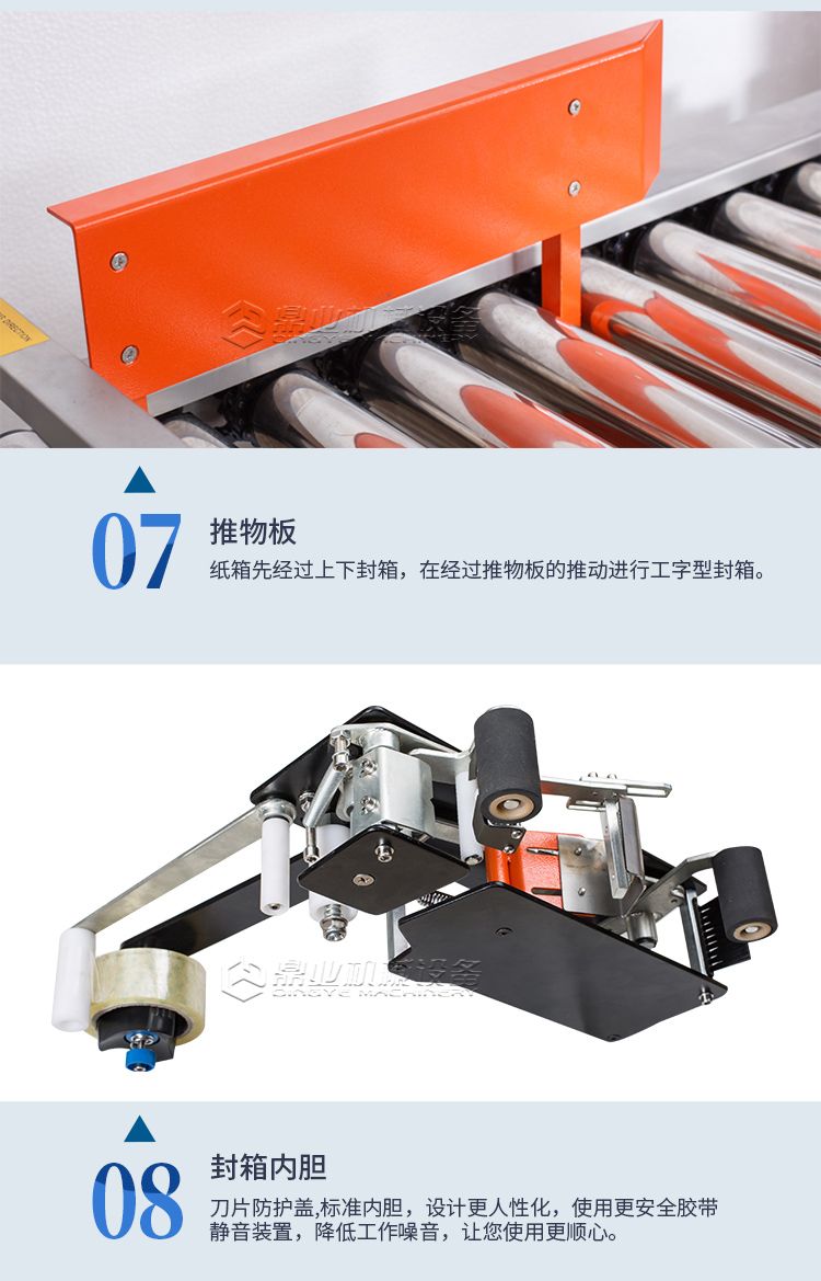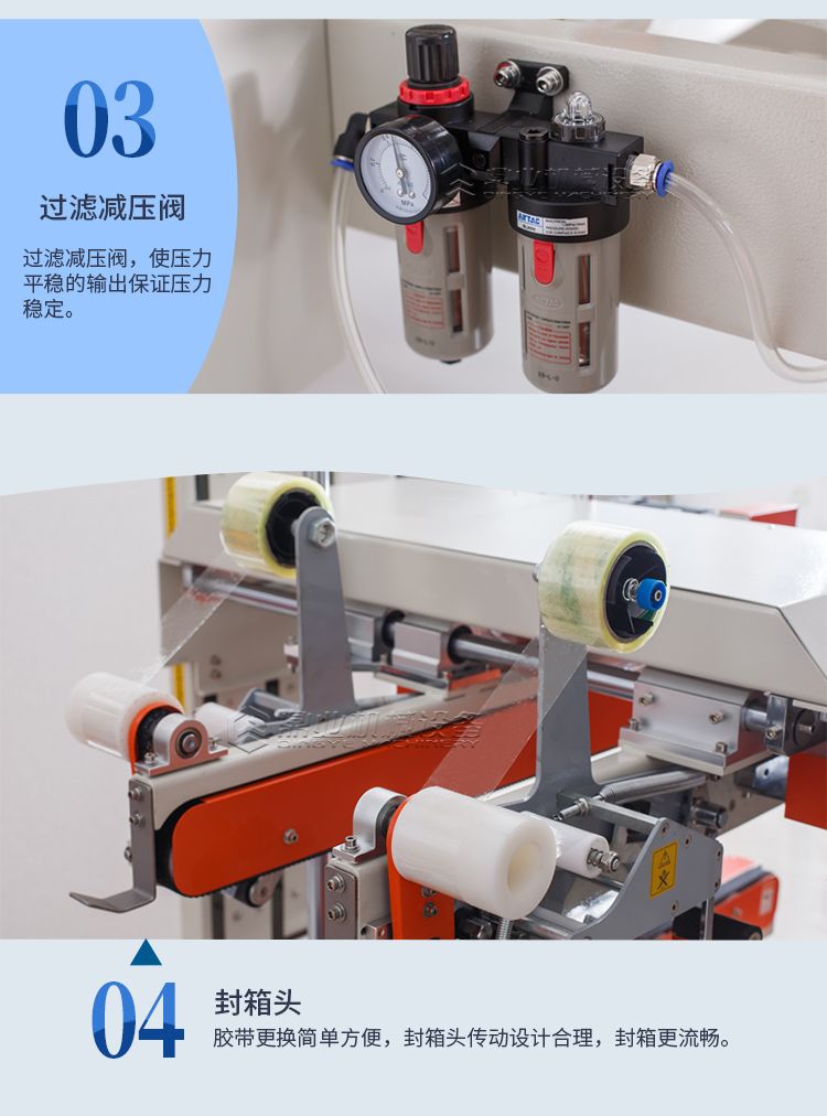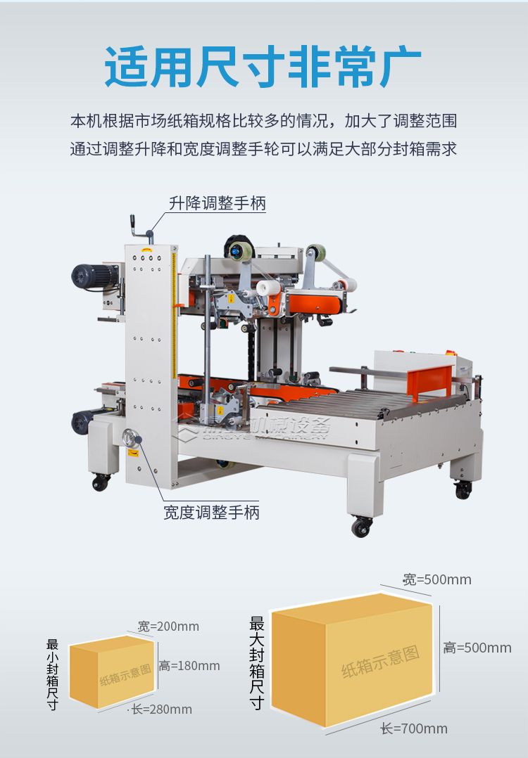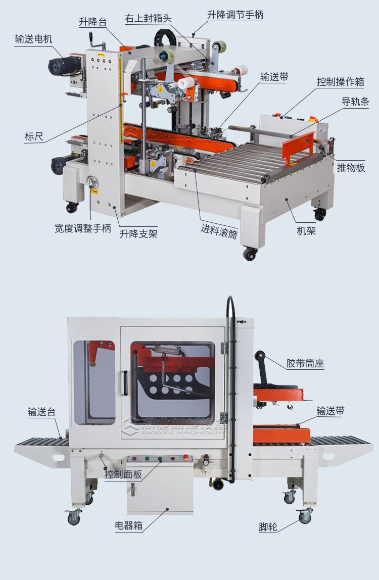 四脚边自动封箱机+折盖封箱机的诞生是根据市场纸箱规格比较多的情况,加大了调整范围通过调整升降和宽度调整手轮可以满足大部分尺寸的纸箱封箱需求。