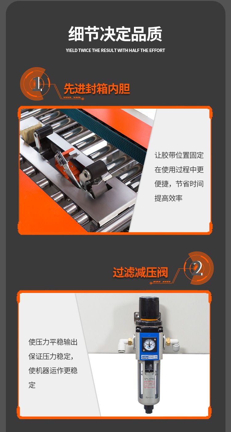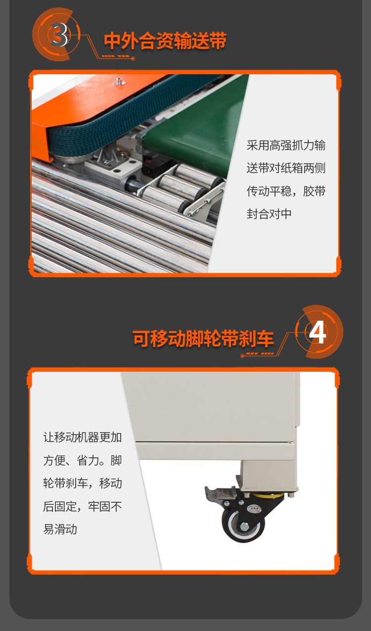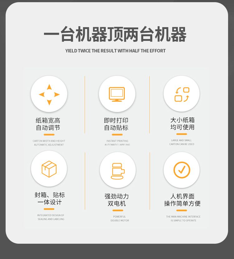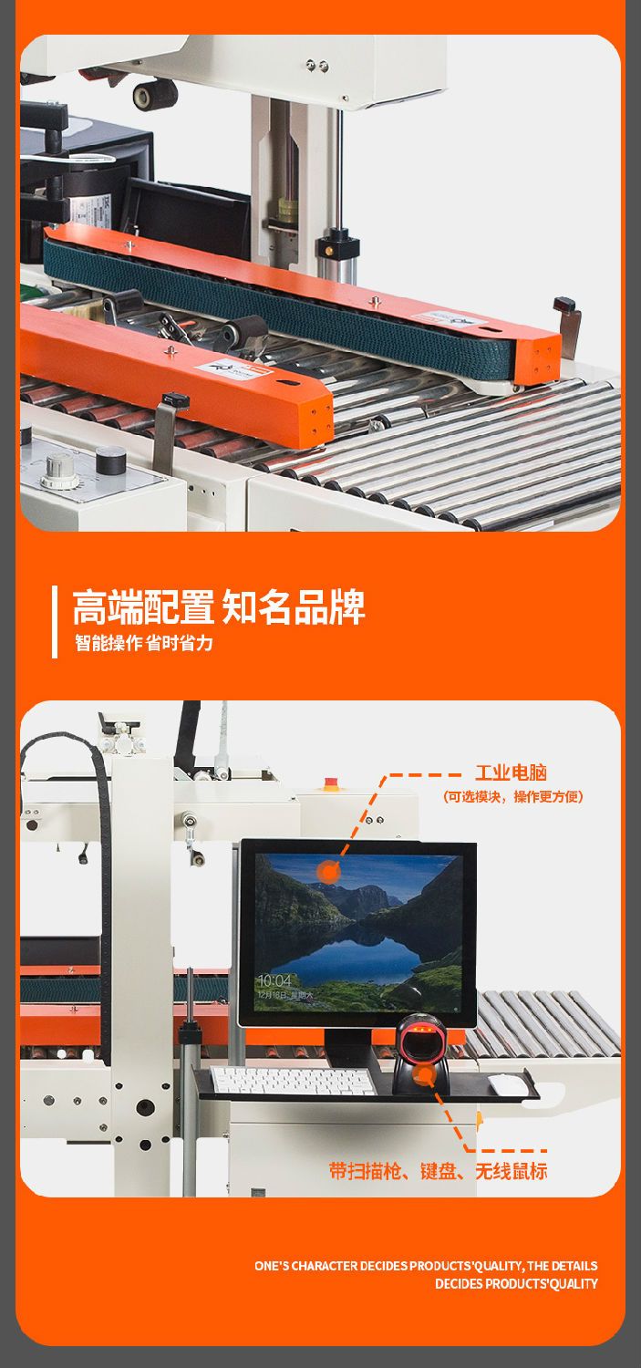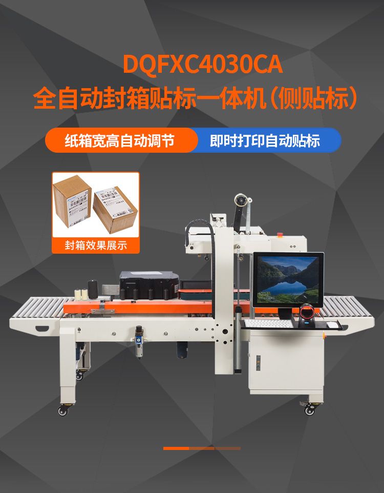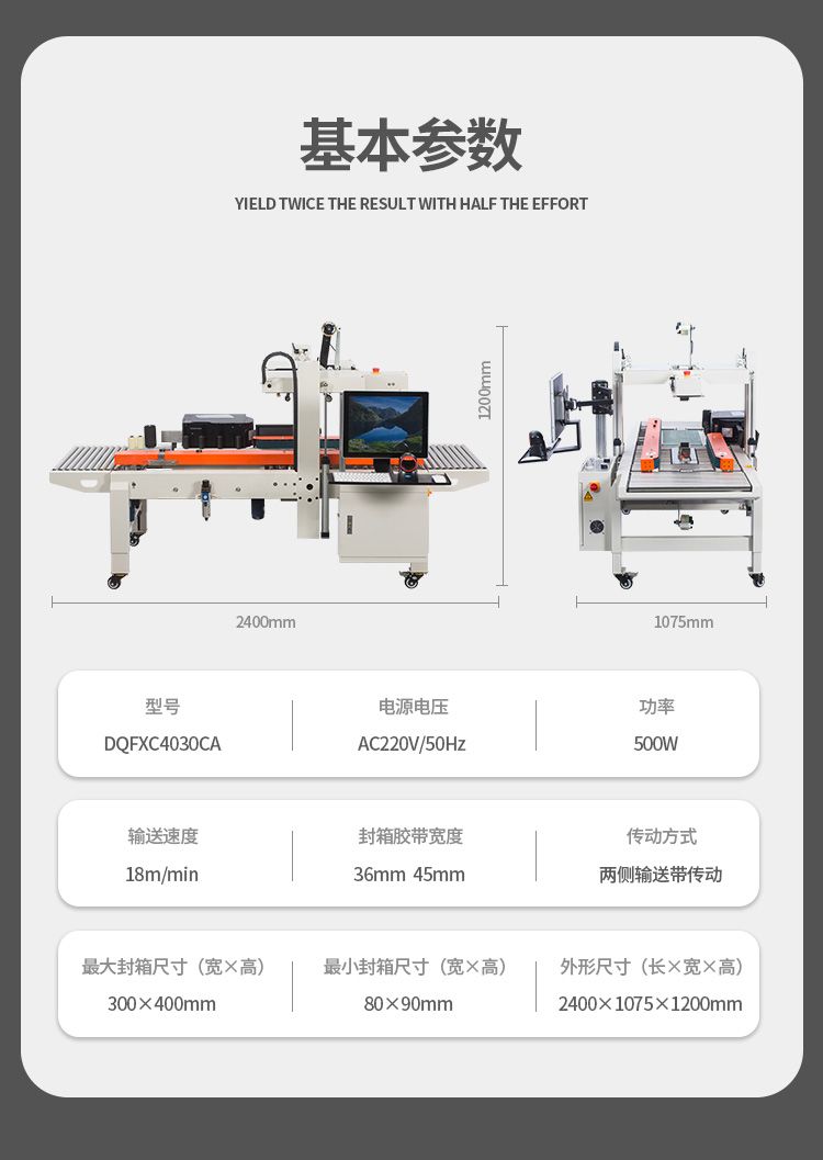 型号 DQFXC4030CA电源电压 AC220V/50Hz功率 500W输送速度 18m/min封箱胶带宽度 36mm 45mm传动方式两侧输送带传动最大封箱尺寸(宽×高) 300×400mm最小封箱尺寸(宽×高) 80×90mm外形尺寸(长×宽×高) 2400×1075×1200mm
