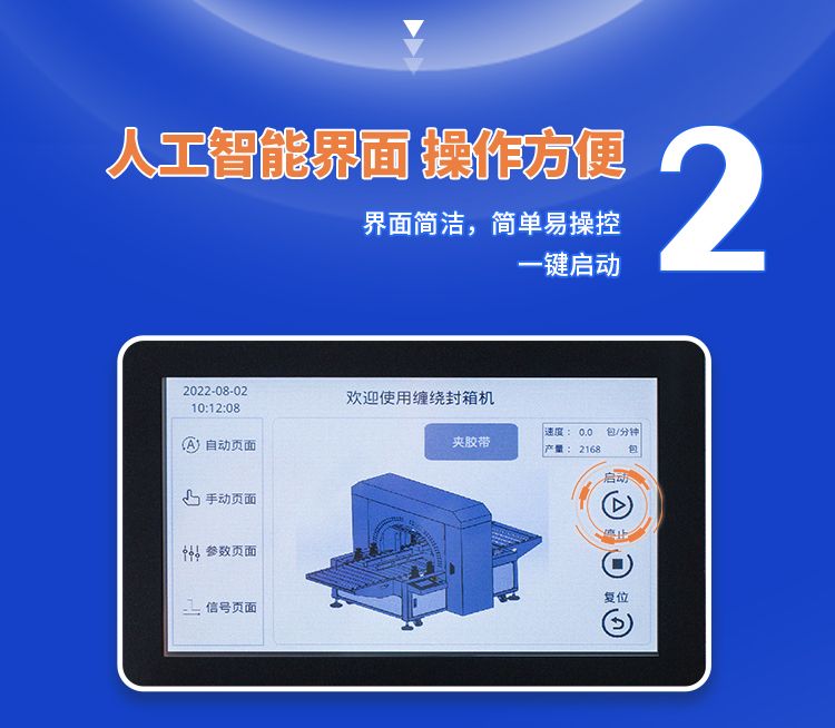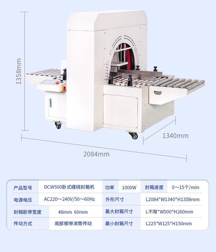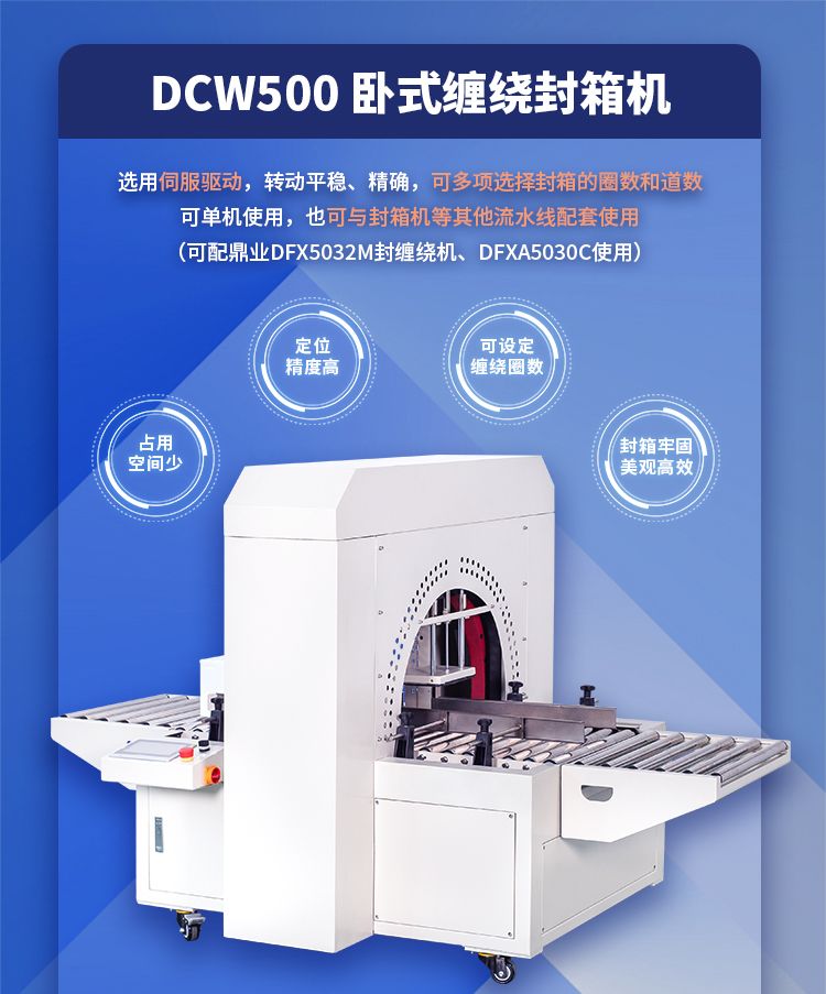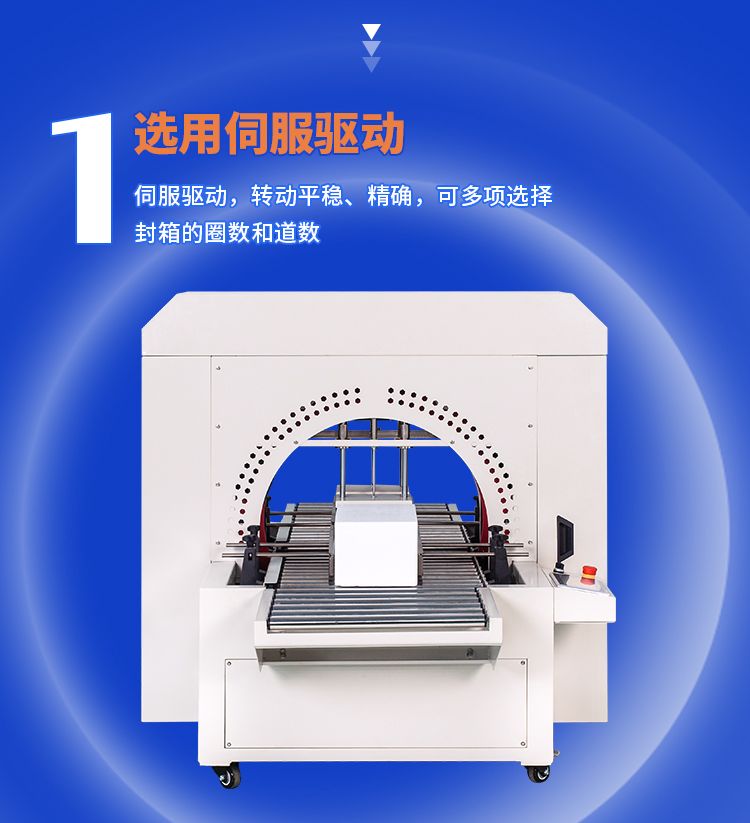 采用楔带传动,传送更平稳,无噪音。缠绕胶带封合平整、牢固、规范、美观、不会撕箱。选用伺服驱动,转动平稳、精确,可多项选择封箱的圈数和道数。可配备油墨打码设备,在纸箱通过时,其侧面可同时打印生产日期、生产批号及必要的文字标注等。本机即可单机使用,也可与生产流水线配套使用。