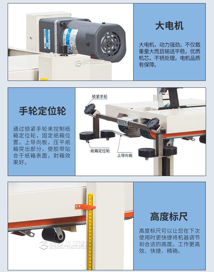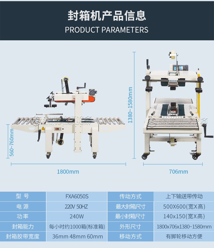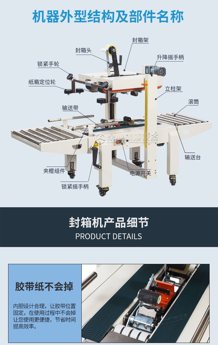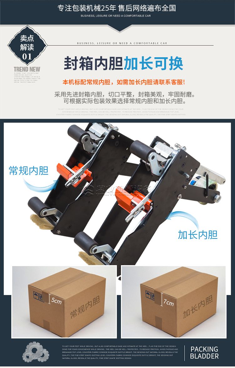 封箱机采用即贴胶带封纸箱封口,经济快速、容易调整,可一次完成上、下封箱动作,也可以采用印字胶带,更可提高产品形象。封箱机的关键部件是驱动电机。电机功率越大越好。轻巧耐用,操作简单。胶带封箱机主要适用于纸箱的封箱包装,即可单机作业成绩,也可与流水线配套使用,广泛应用在家用电器、纺织、制药、烟草、食品、百货、医药、化工等行业。