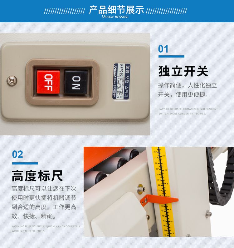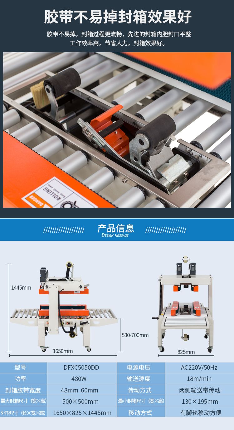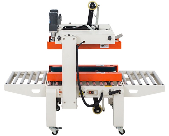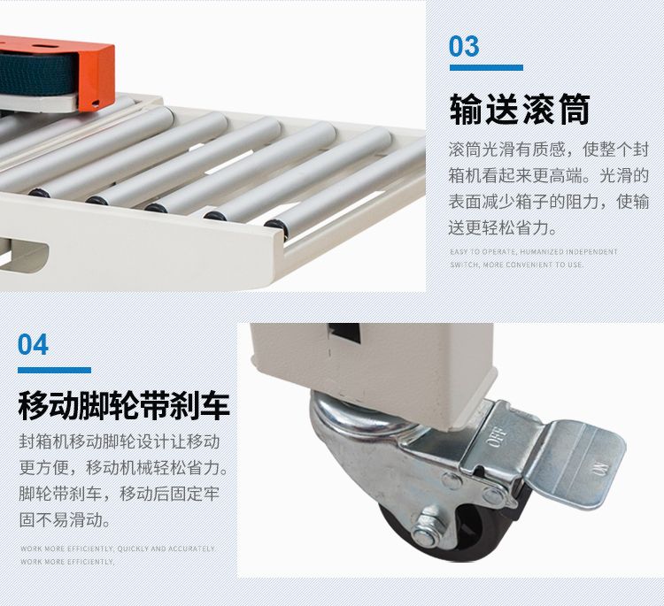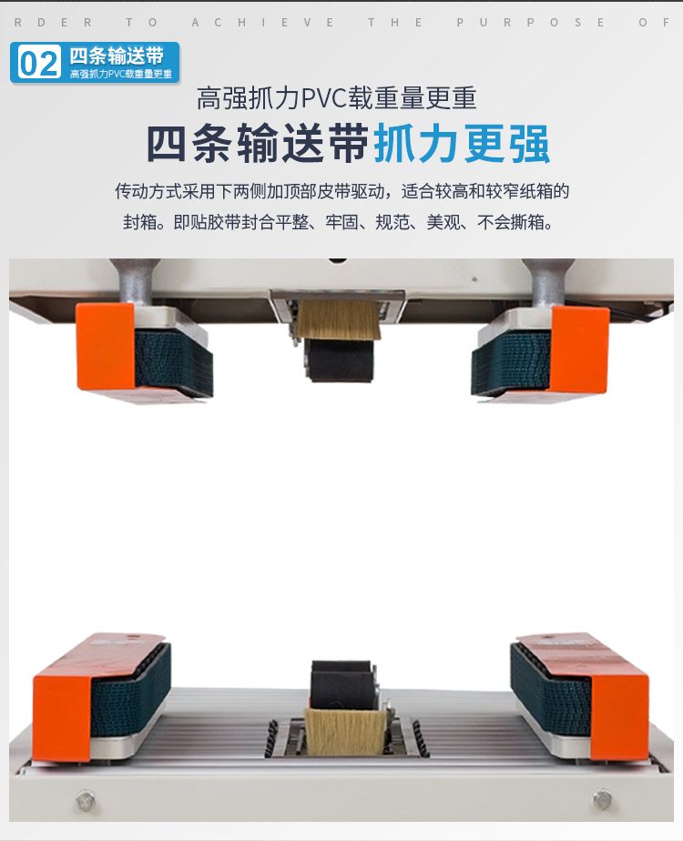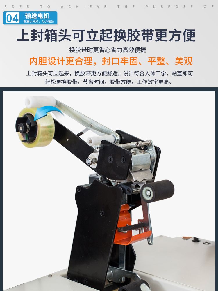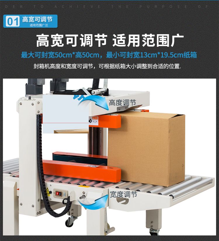 本机适合较高和较摘纸箱使用,可是有胶带印字,提高产品的外观形象。封箱机高度和宽带可调节,可根据纸箱大小来调整到合适的位置。