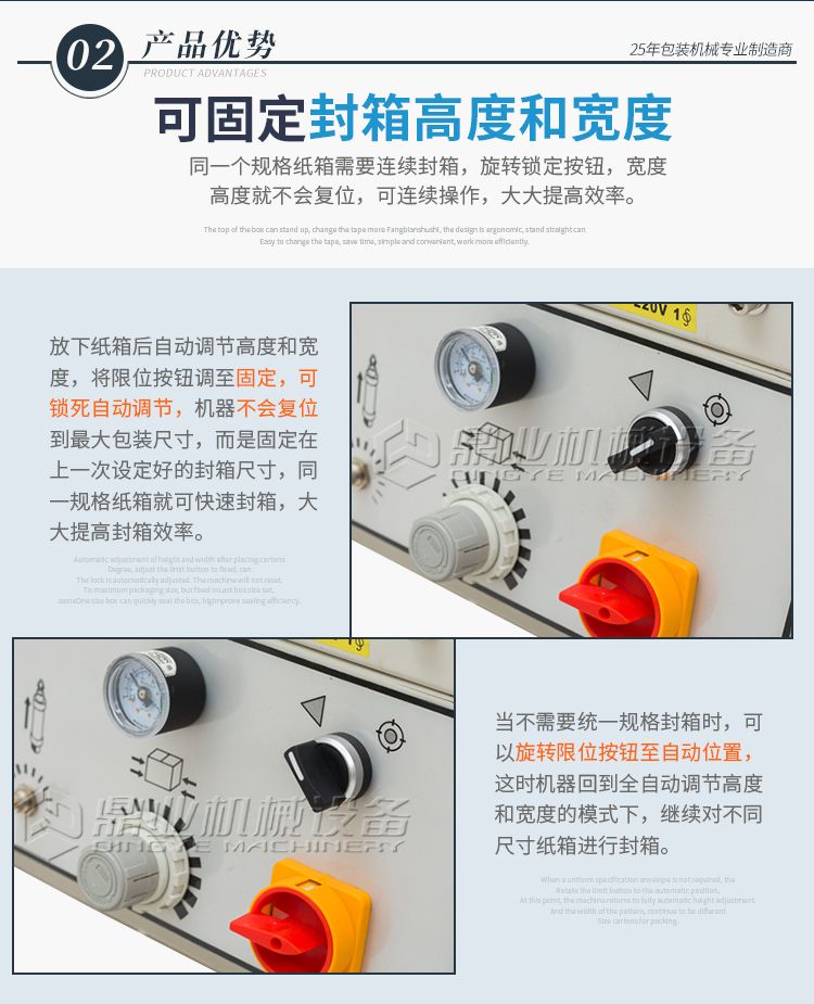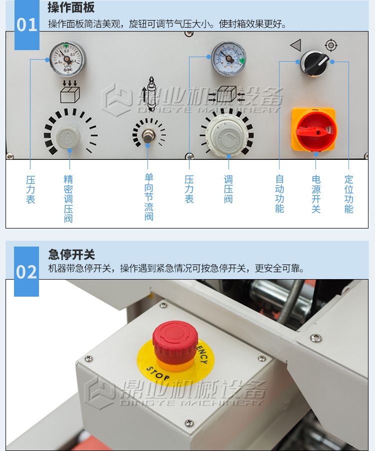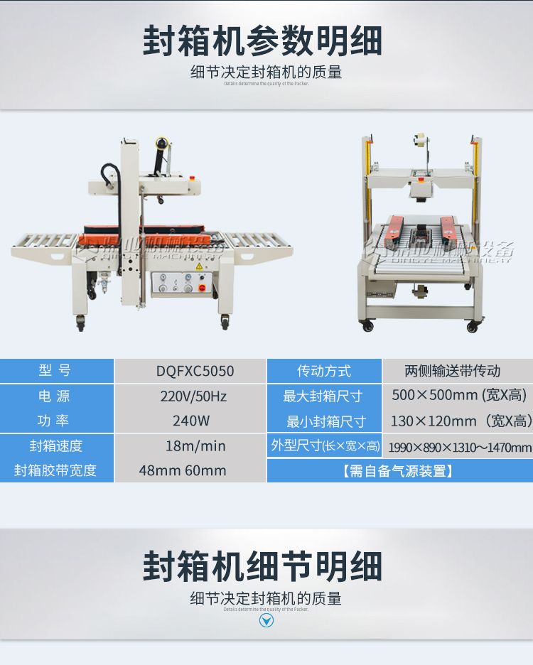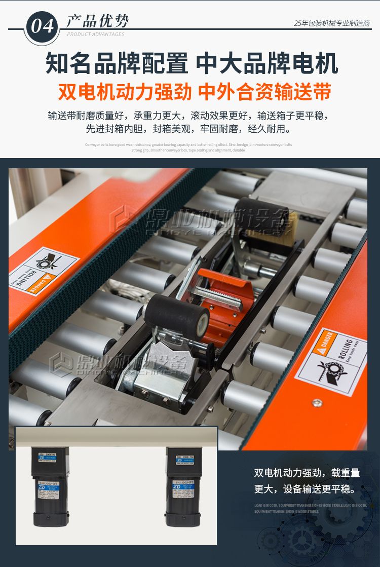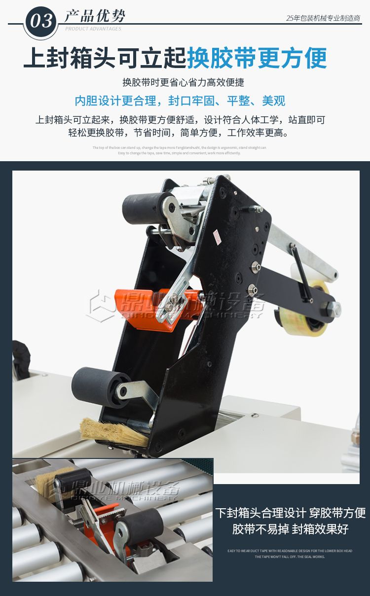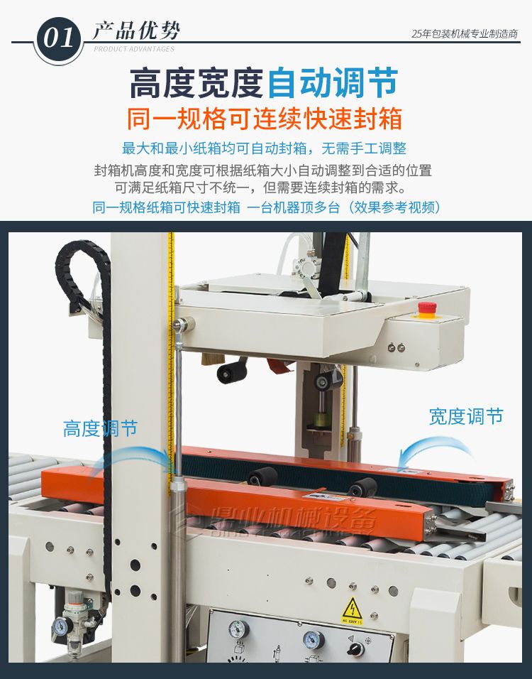 可一次完成上下封箱动作,采用印字胶带,更可提高产品形象。左右驱动系统确保重纸箱输送,机芯上下可互换,皮带的张力、胶粘带张力调整容易,可适用于软硬纸箱,可单机也可流水线使用。