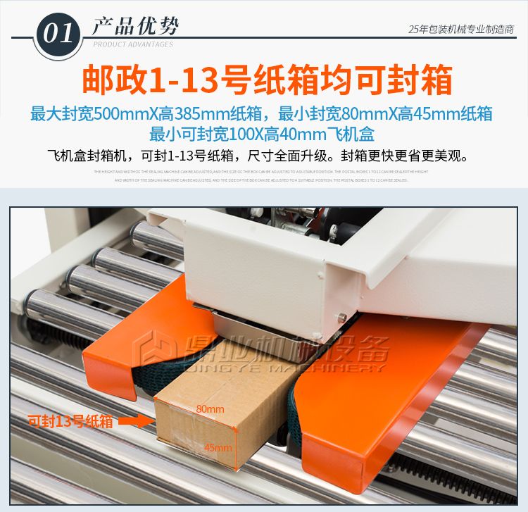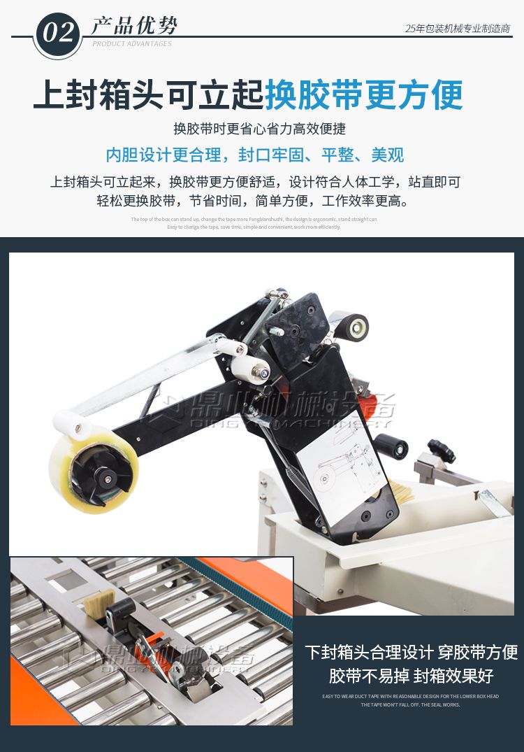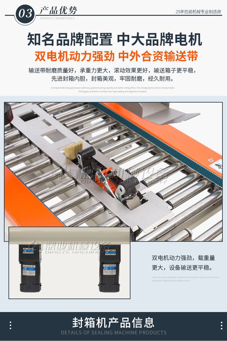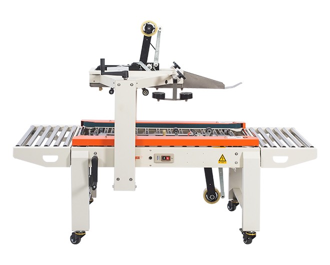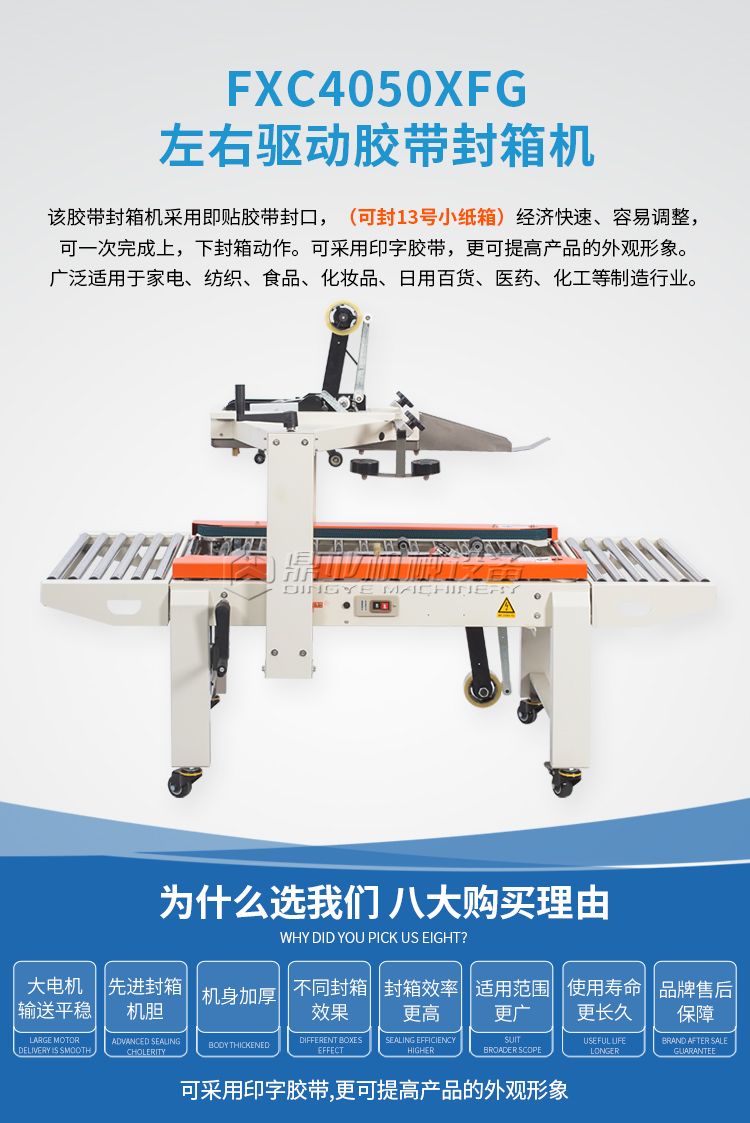 左右驱动胶带封箱机主要适用于纸箱的封箱包装,即可单机作业成绩,也可与流水线配套使用,广泛应用在家用电器、纺织、食品、百货、医药、化工等行业。封箱机采用即贴胶带封纸箱封口,经济快速、容易调整,可一次完成上、下封箱动作,采用印字胶带,更可提高产品形象。