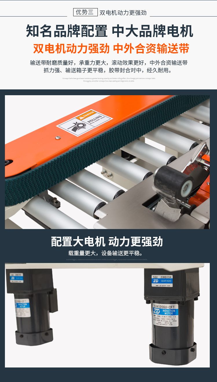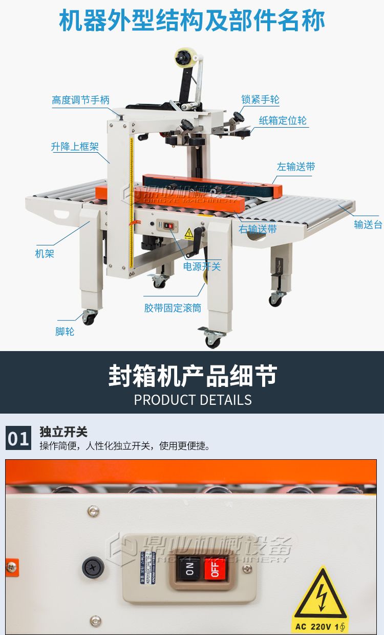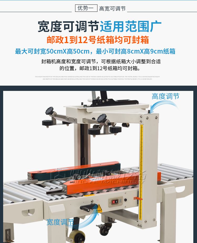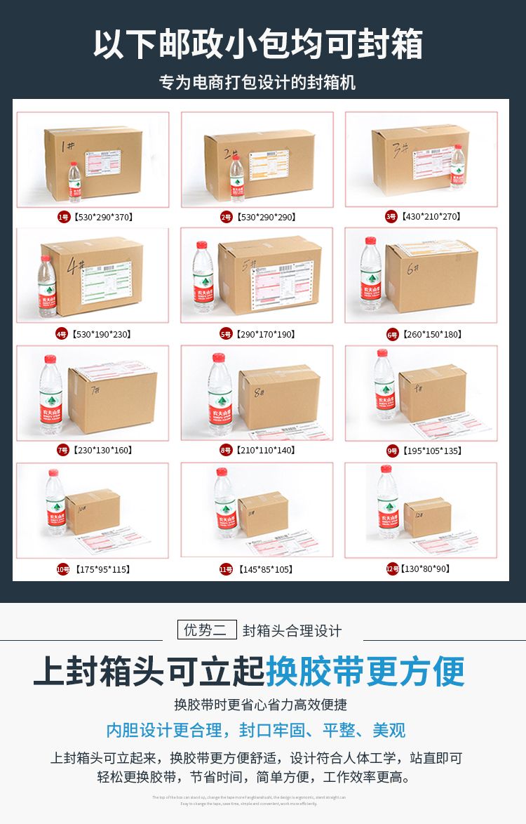 专门为电商行业设计研发,邮政纸箱1号-12号都能适用。不用调整机器就可以打包,该机属机械式结构,部分采用进口零件,后刀刃稳定可靠,调整方便等特点。