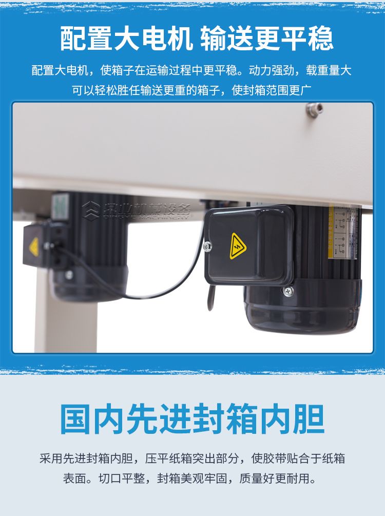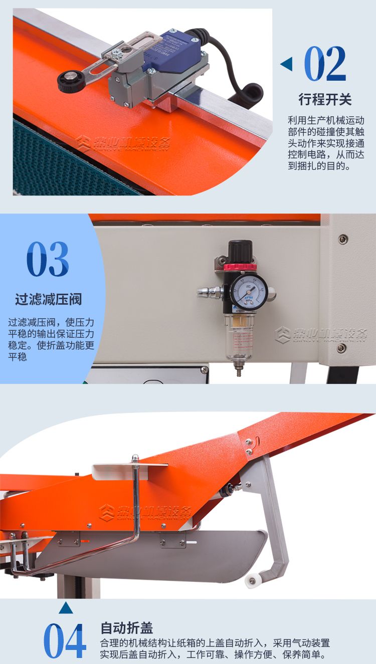 自动折盖封箱捆扎生产线集自动折盖、封箱及捆扎为一体,具有连续自动折盖、上下封箱、多道捆扎包装功能;实现封箱捆扎自动化、节省生产成本。具有自动停线、自动唤醒功能。可通过简单方便的调整实现纸箱规格的变换。