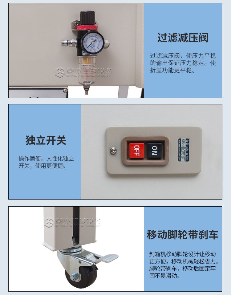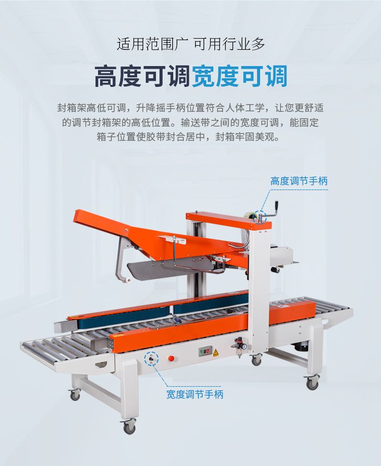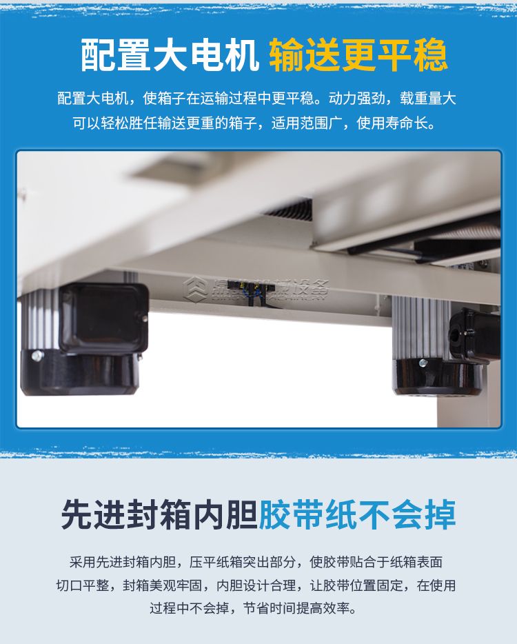 自动折盖封箱机主要适用于纸箱的折盖和封箱包装,适合单独操作或连接到自动流水线,广泛应用在家用电器,纺织,食品,百货,医药,化工等行业。纸箱上前盖,侧盖及后盖自动折入,快速,平顺。