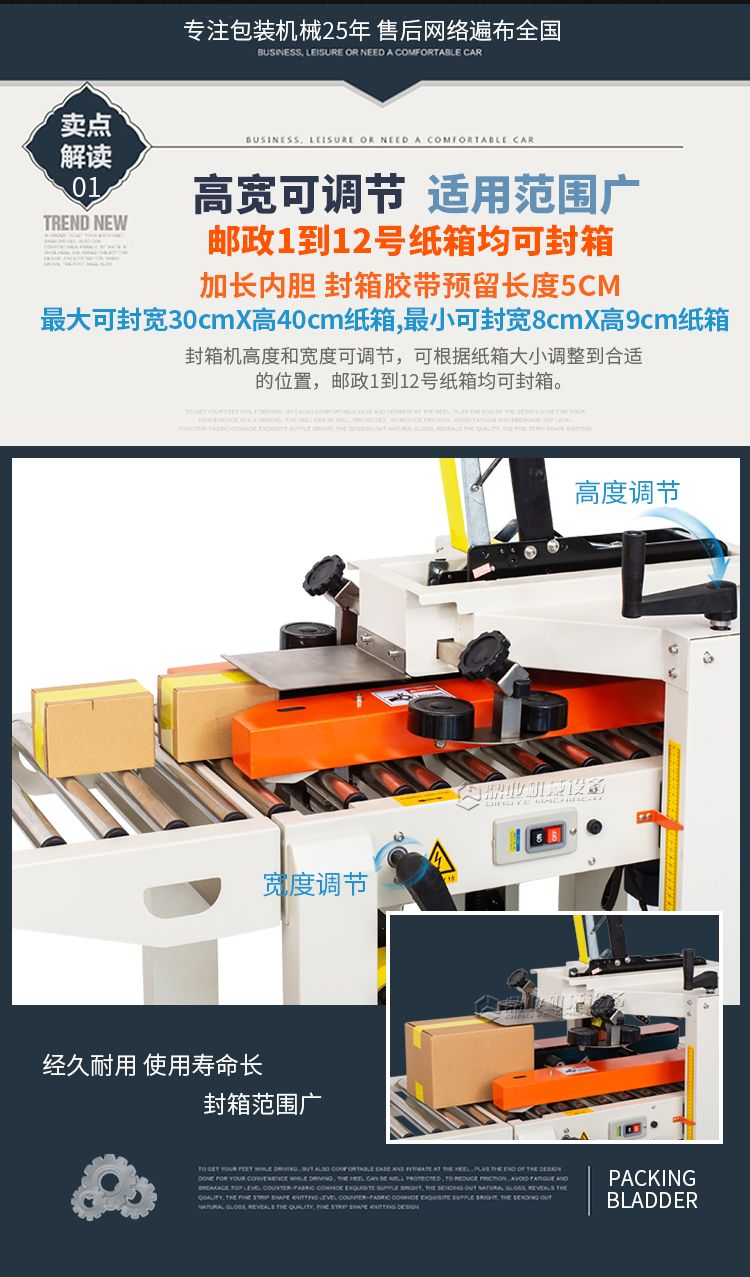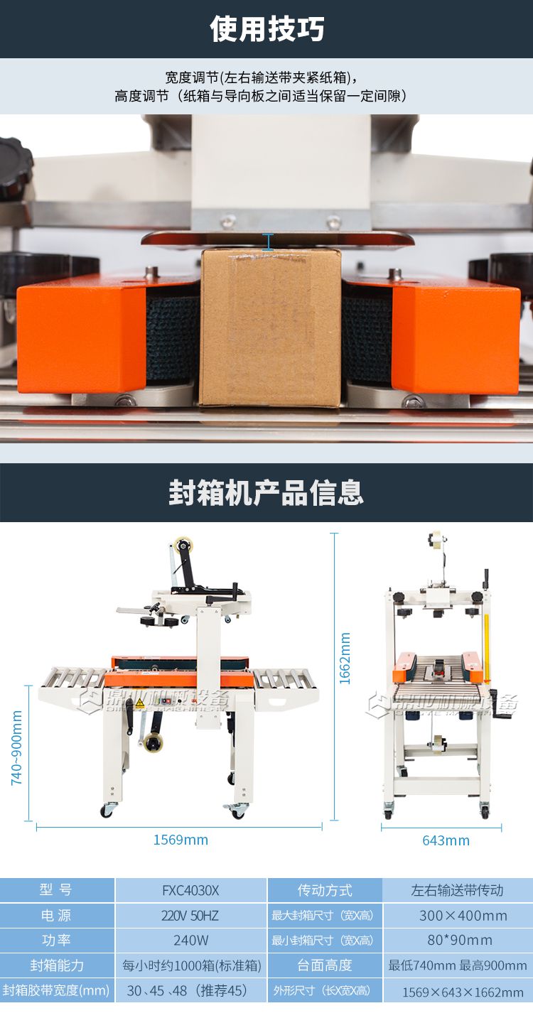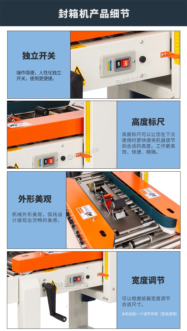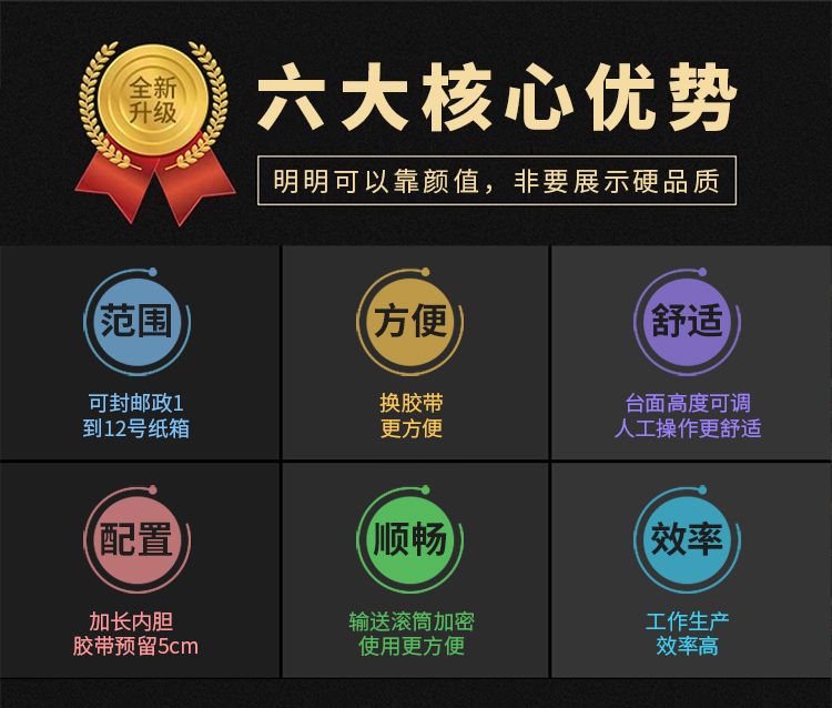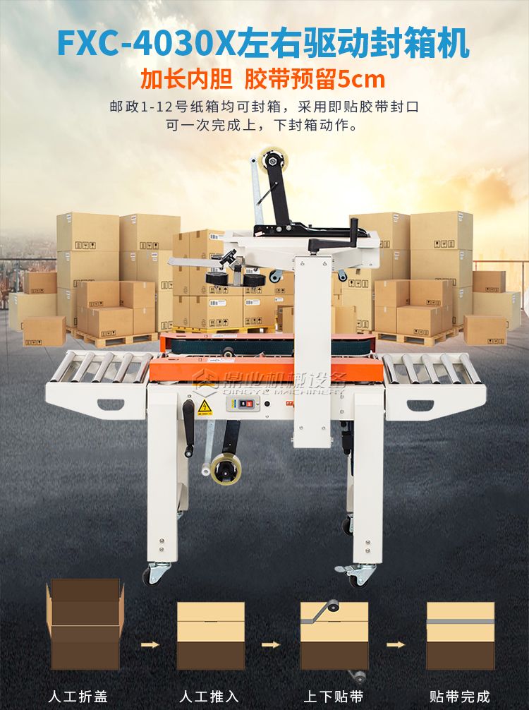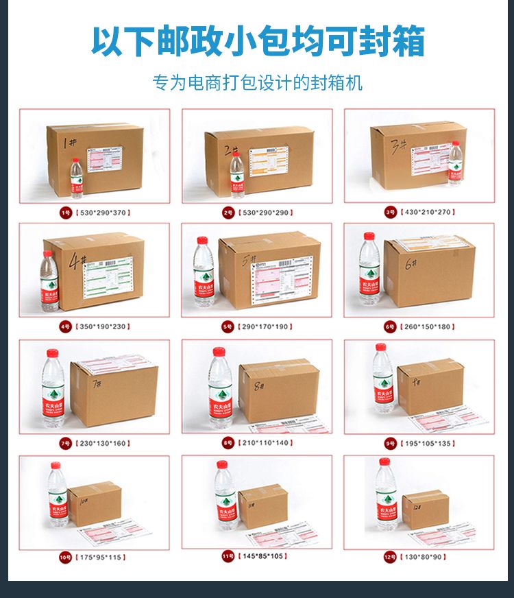 加长内胆,胶带预留5CM,邮政1-12号纸箱均可封箱,采用即贴胶带封口可一次完成上,下封箱动作。最大封箱尺寸:W300×H400mm,最小封箱尺寸:W80×H90mm;封箱胶带宽度:30mm 45mm 48mm;