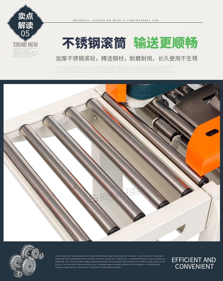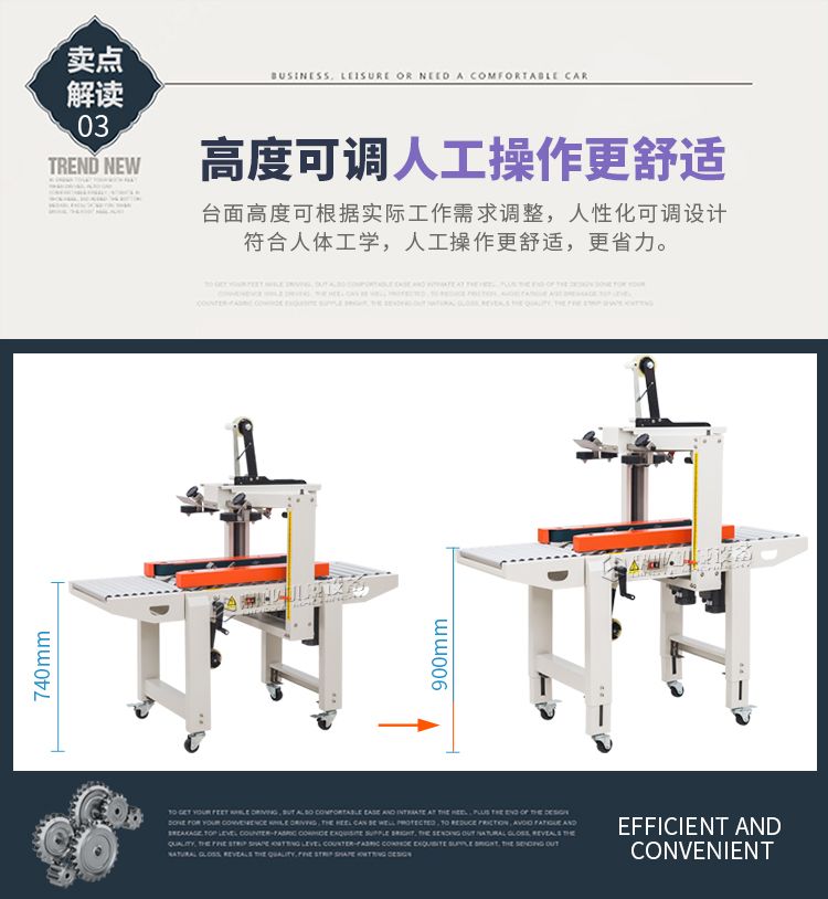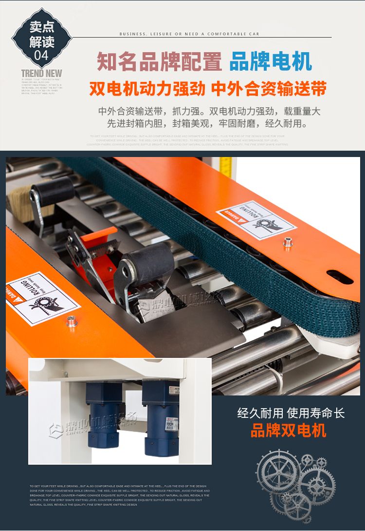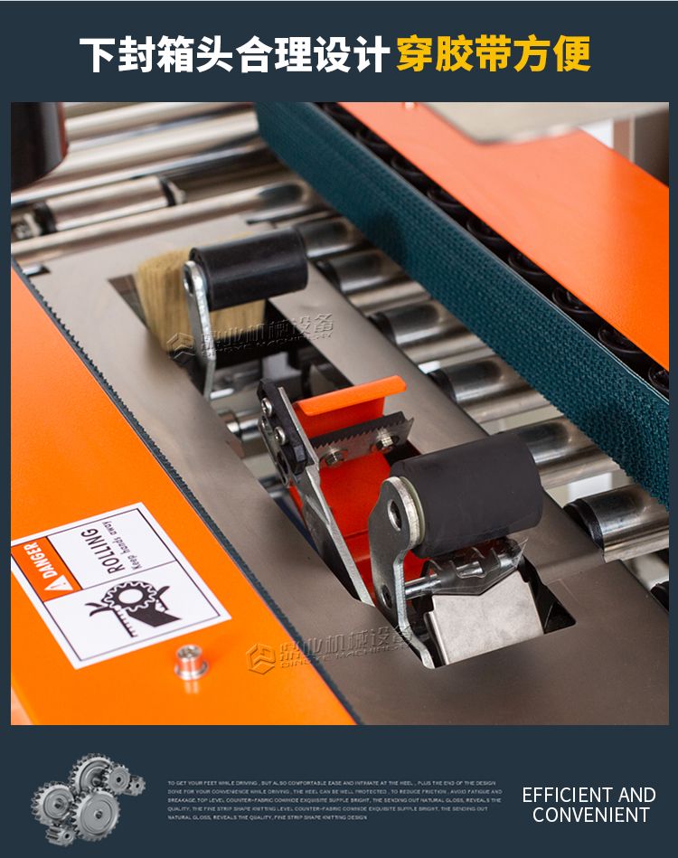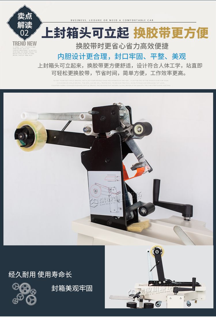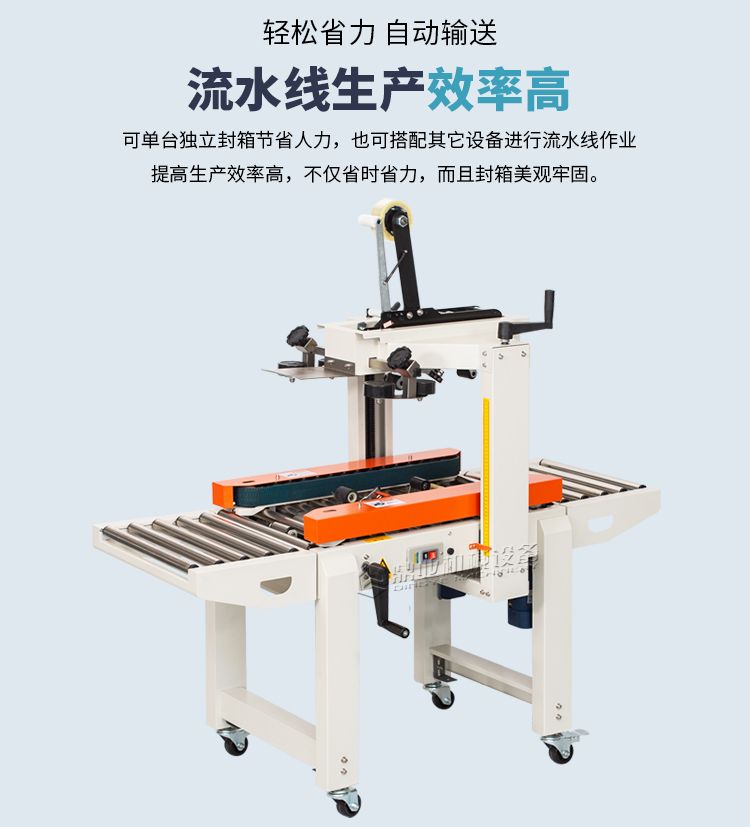 加长内胆,胶带预留5CM,邮政1-12号纸箱均可封箱,采用即贴胶带封口可一次完成上,下封箱动作。最大封箱尺寸:W300×H400mm,最小封箱尺寸:W80×H90mm;封箱胶带宽度:30mm 45mm 48mm;