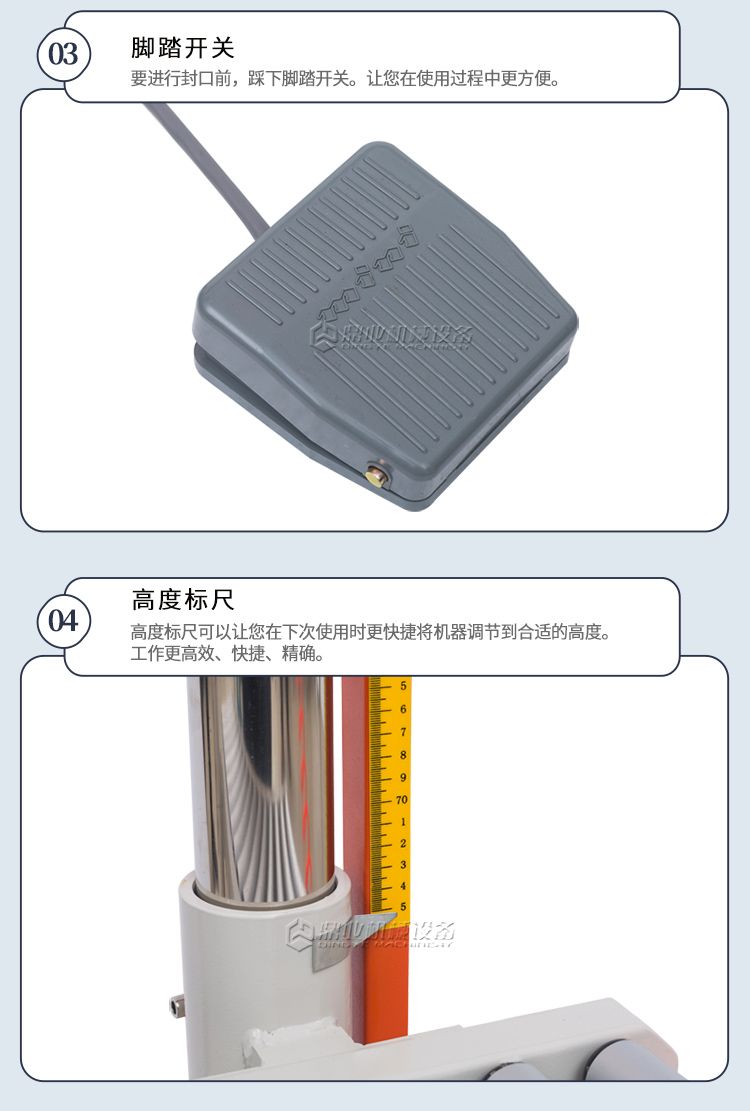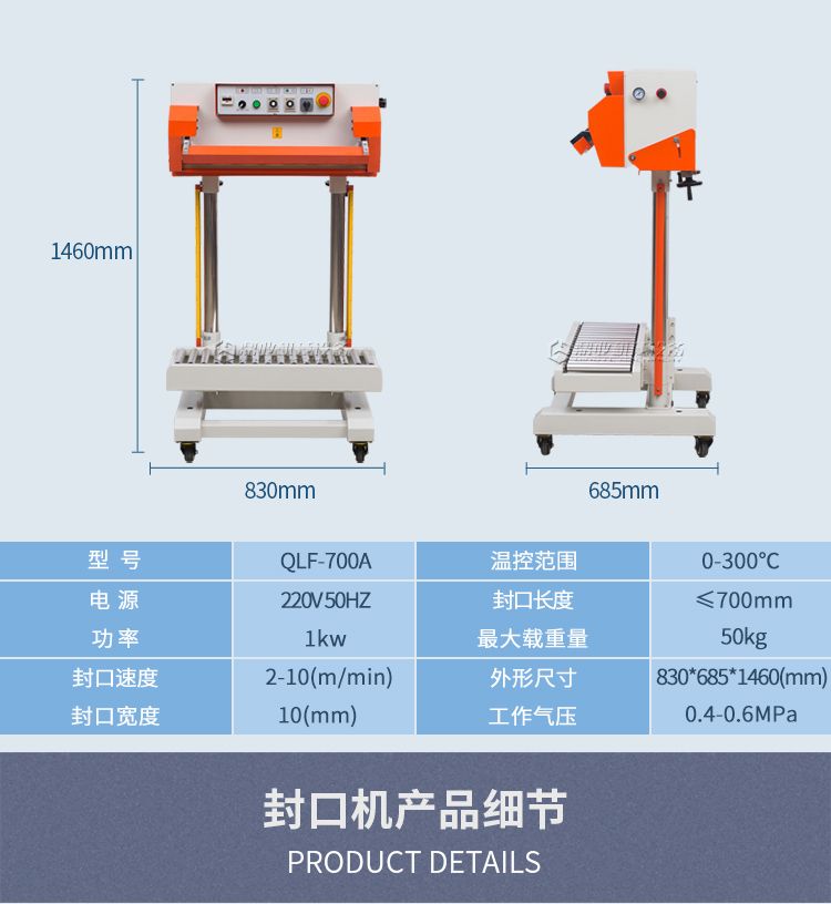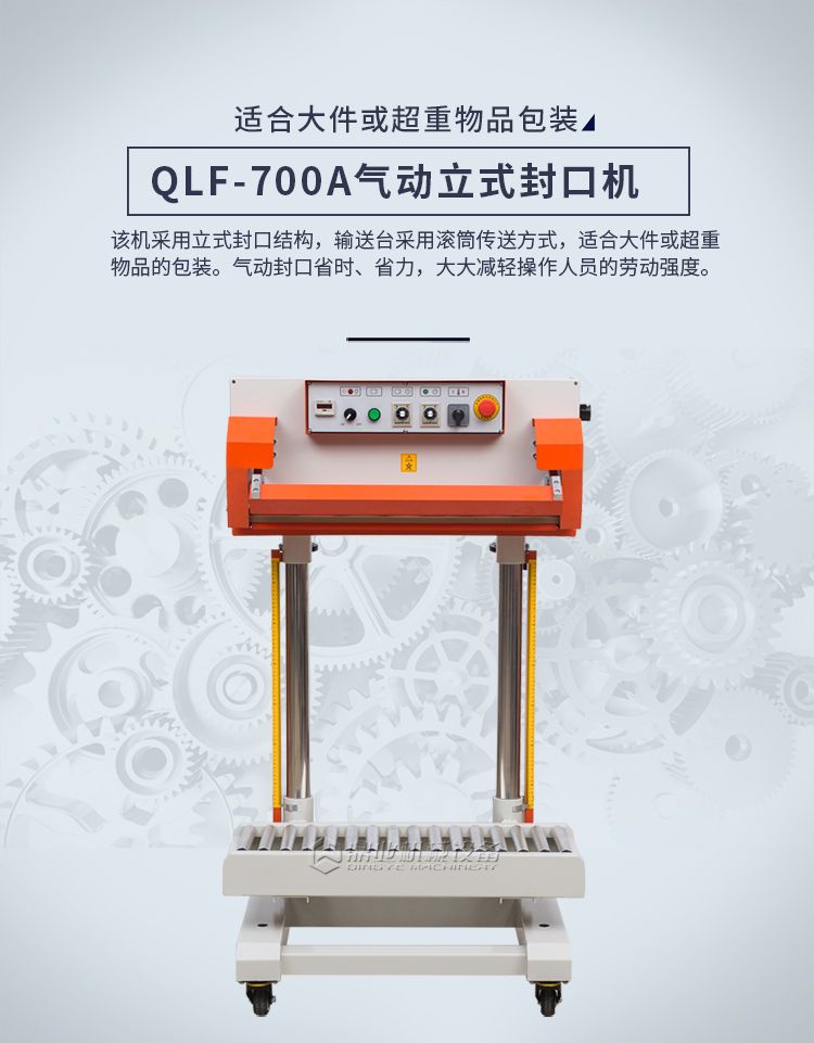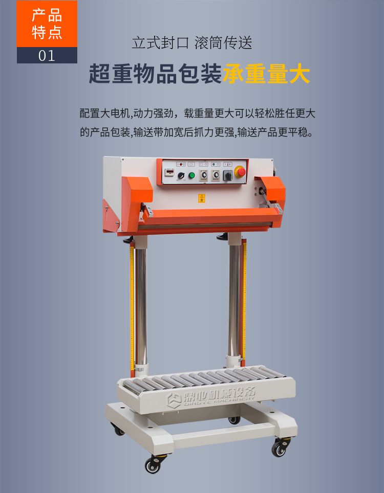 该机采用立式封口结构,输送台采用滚筒传送方式,适合大件或超重物品的包装。由于封口功率强大,可轻松封合单层厚度≤0.2MM的普通塑料薄膜或复合袋等。如有特殊的封合需求,还可选用双加热的机型(袋口两侧同时加热),其单层的厚度更可达0.2MM以上。广泛应用化工、粮食、食品、饲料等行业。