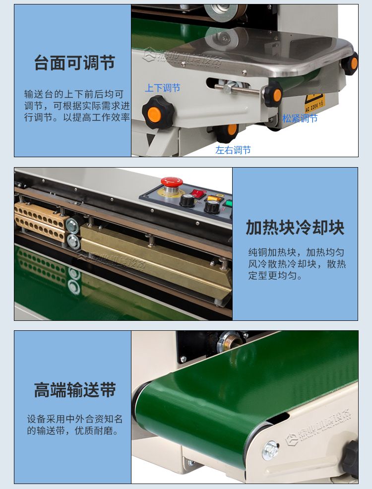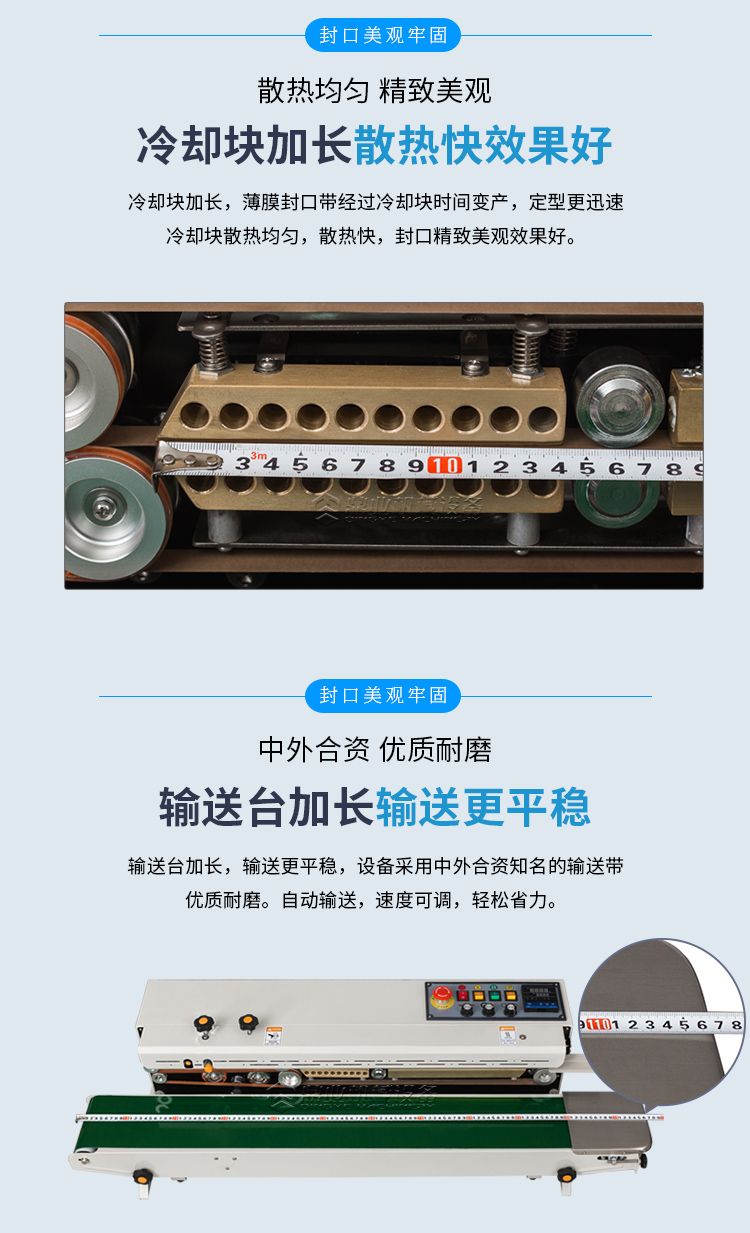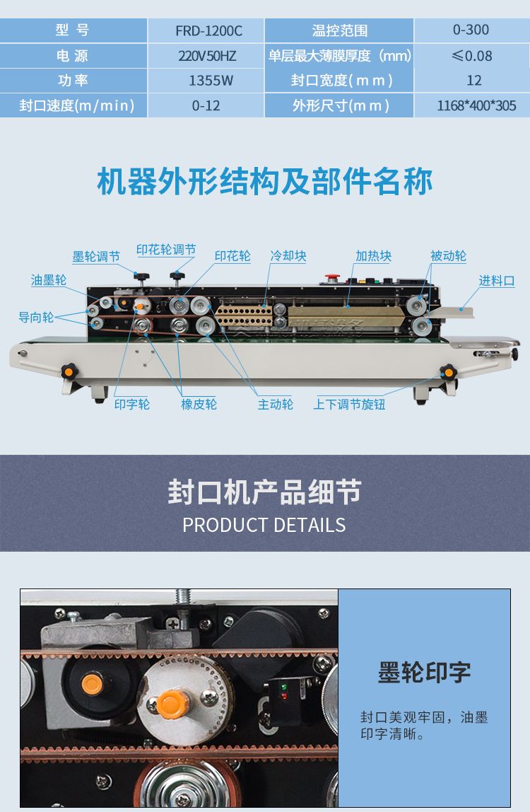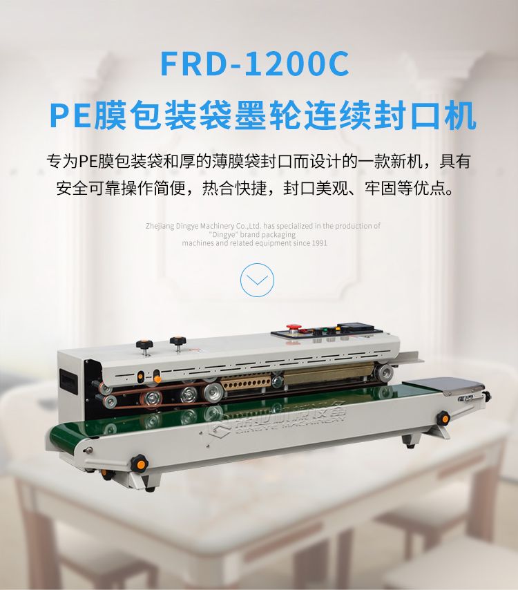 FRD-1200C PE膜包装袋墨轮连续式封口机专为PE膜包装袋和厚的薄膜袋封口而设计的一款新机,具有安全可靠操作简便,热合快捷,封口美观,牢固等优点。