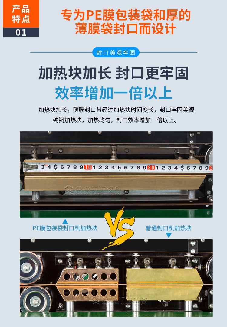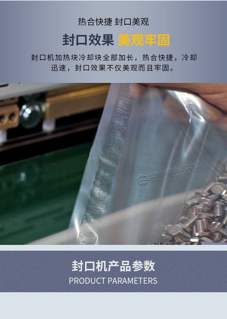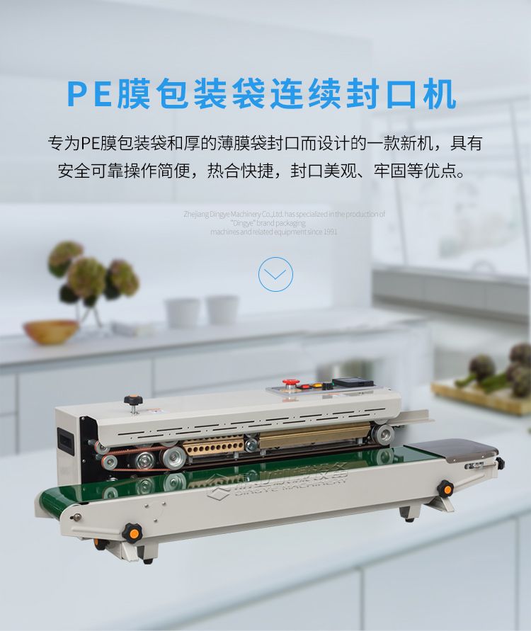 本机使用于塑料薄膜的封口、制袋,可广泛应用在食品、医药、化工、日用、种子等行业。由于本机电气控制简单,合理而精制的机械传动,从而结构性能非常稳定,故障率低,且使用寿命更长。可长时间连续工作,能满足大批量生产需求。产品经过该机的封口包装后,且具外形美观、整洁、防尘、防潮、防破损、便于搬运和储存。大大降低产品的损耗,且具包装成本优势。
