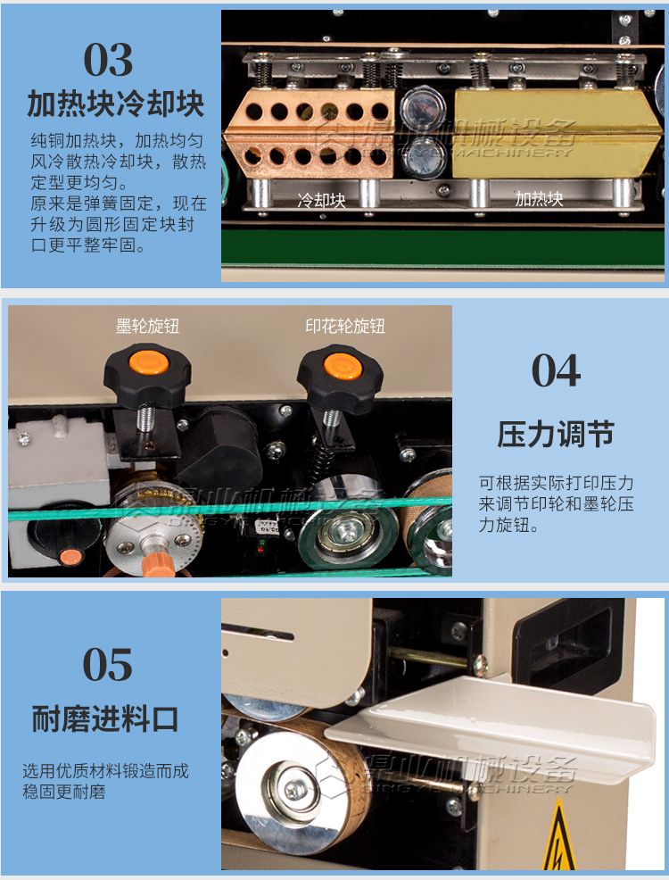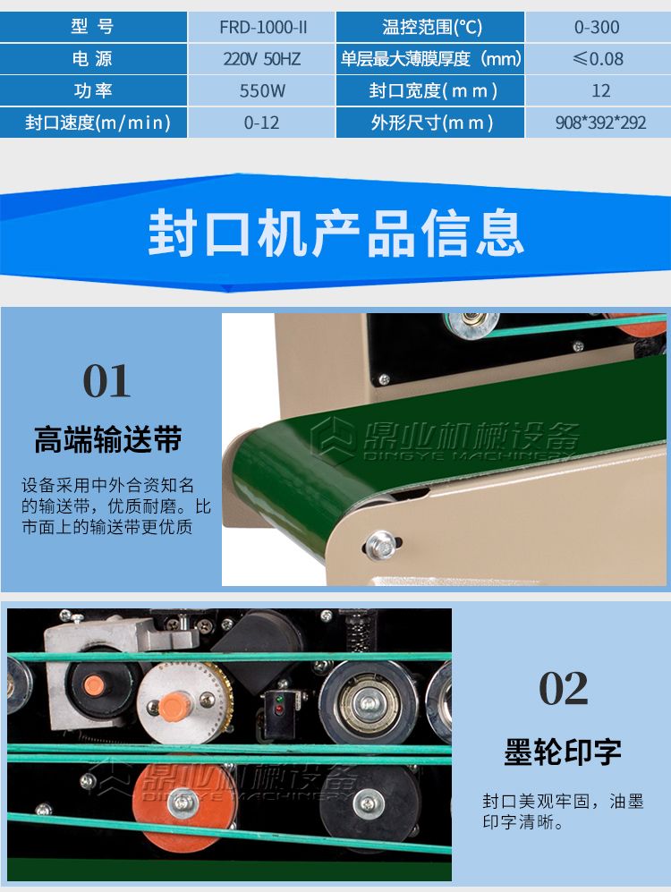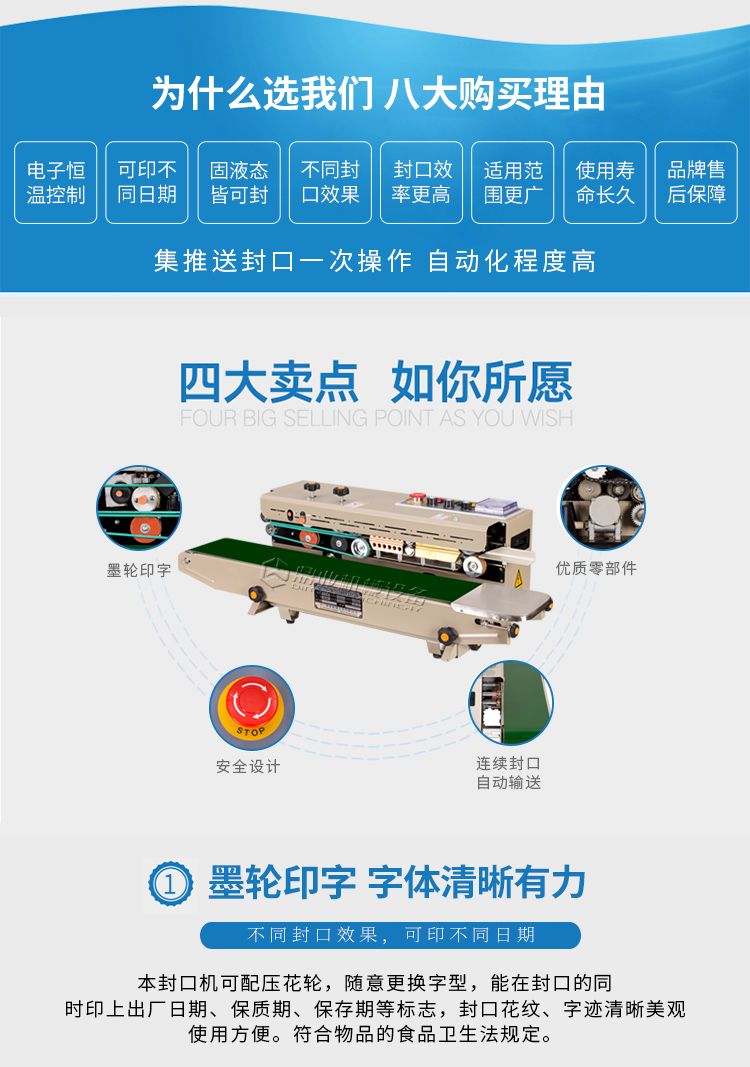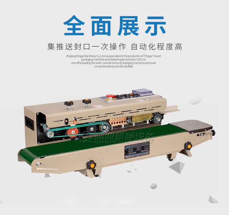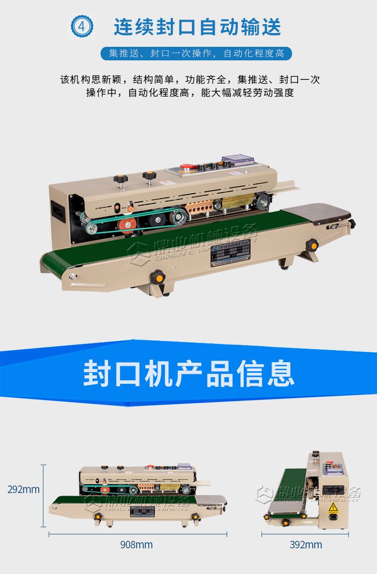 该机具有连续输送、封口、油墨印制标签(出厂日期、生产批号等)一次完成之功效,可封合印制任何一种可热性的薄膜。