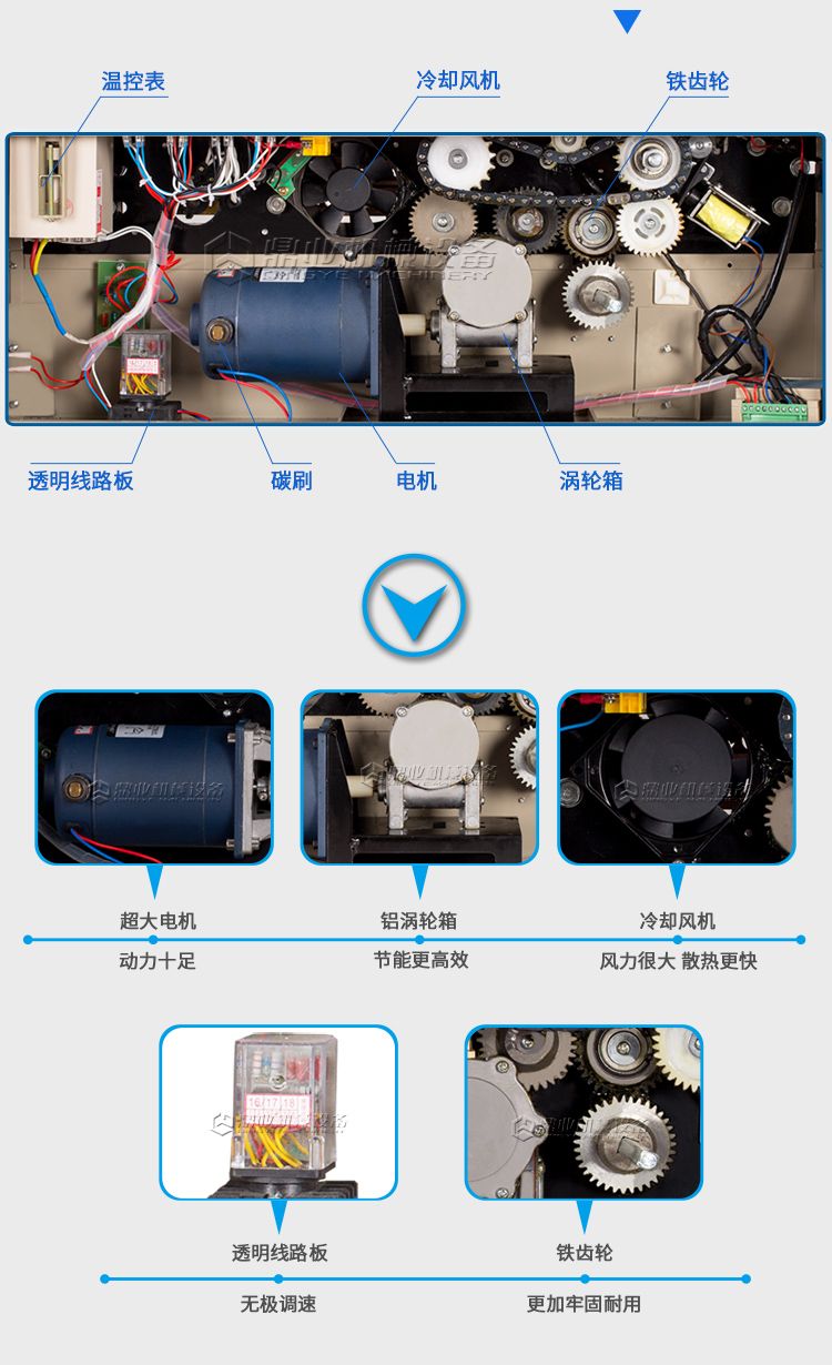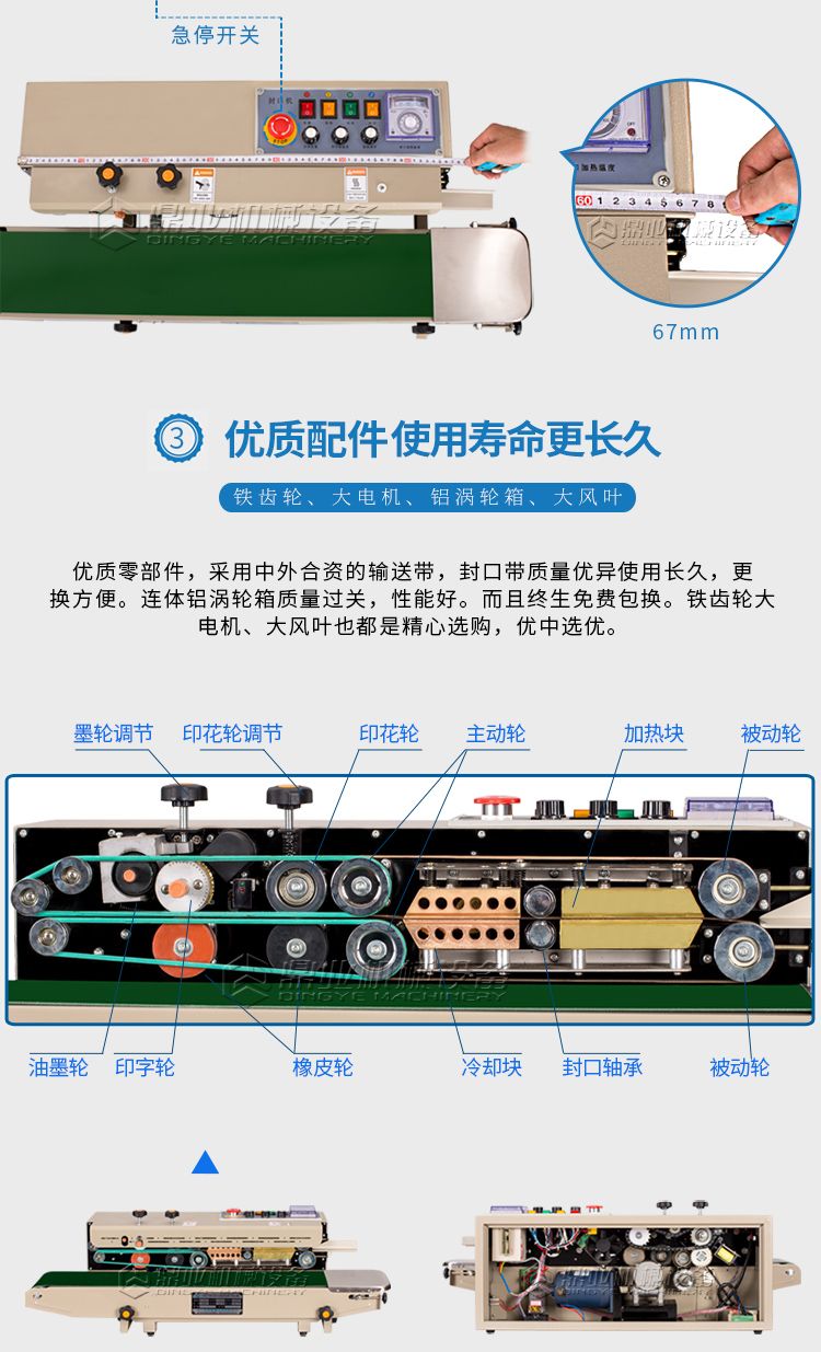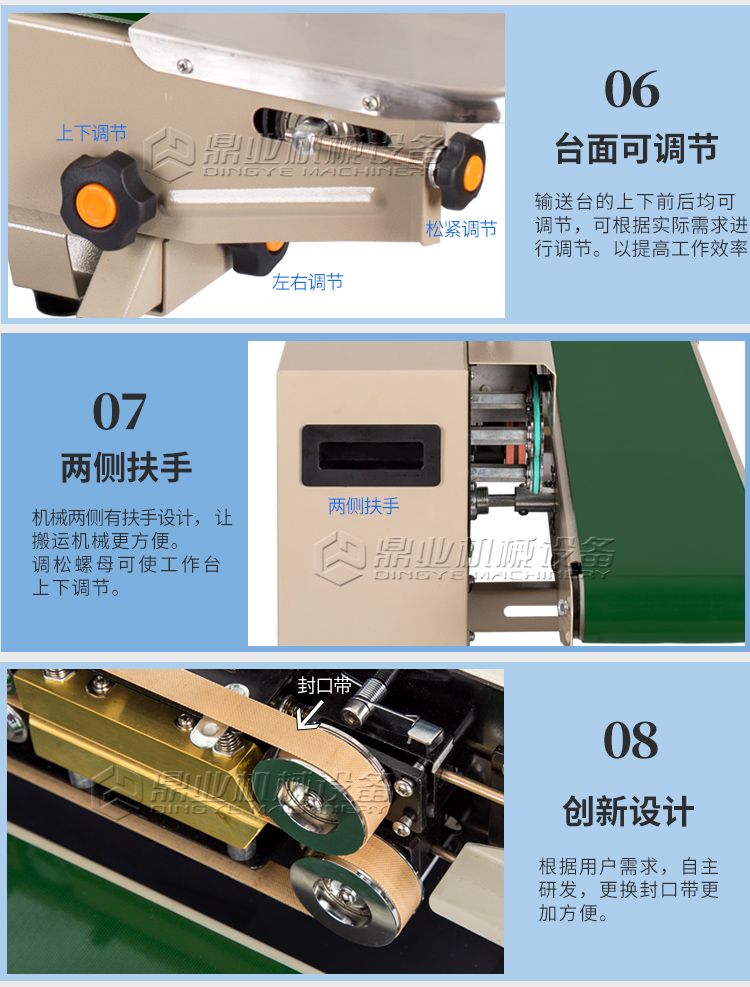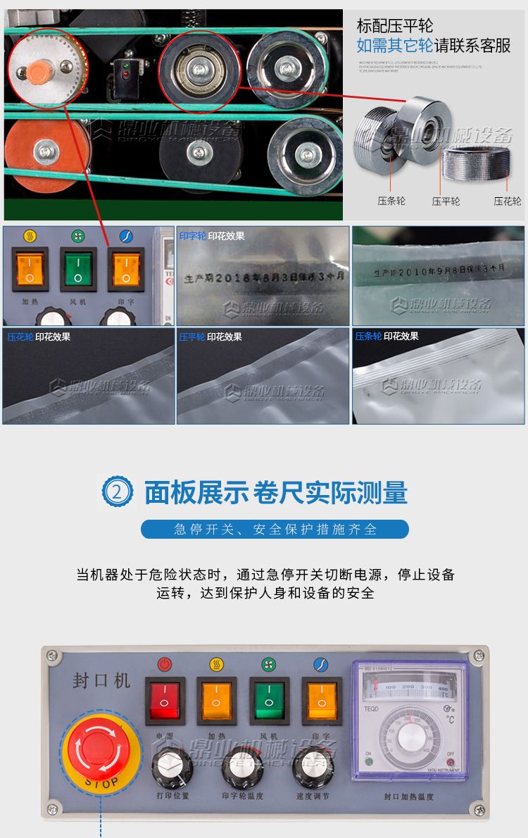 该机具有连续输送、封口、油墨印制标签(出厂日期、生产批号等)一次完成之功效,可封合印制任何一种可热性的薄膜。