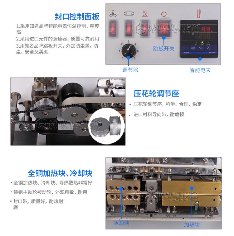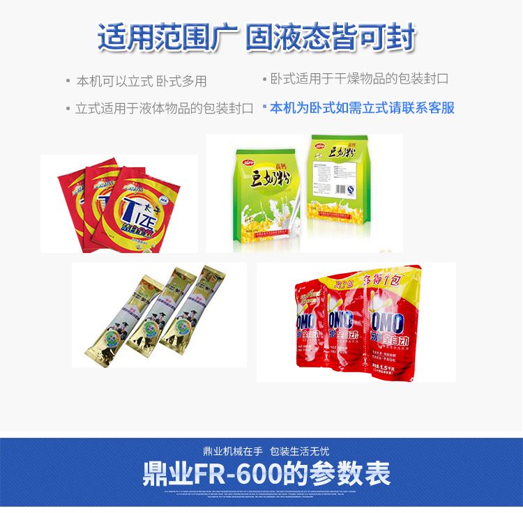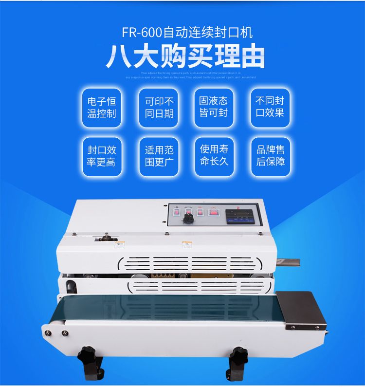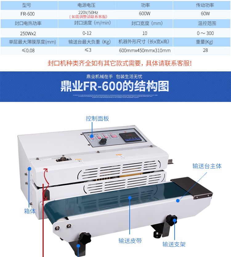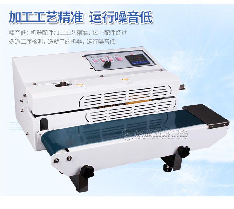 本机适用于塑料薄膜的封口、制袋,可广泛应用在食品、医药、化工、日用、种子等行业。由于本机采用电子恒温控制和无极调速的传动机构,可封制各种不同材料的朔料包装袋,由于本机器体积小,应用广泛,封口长度不受限制,所以可与各种包装流水线配套使用。它将是工厂、商店批量产品包装的封口设备。