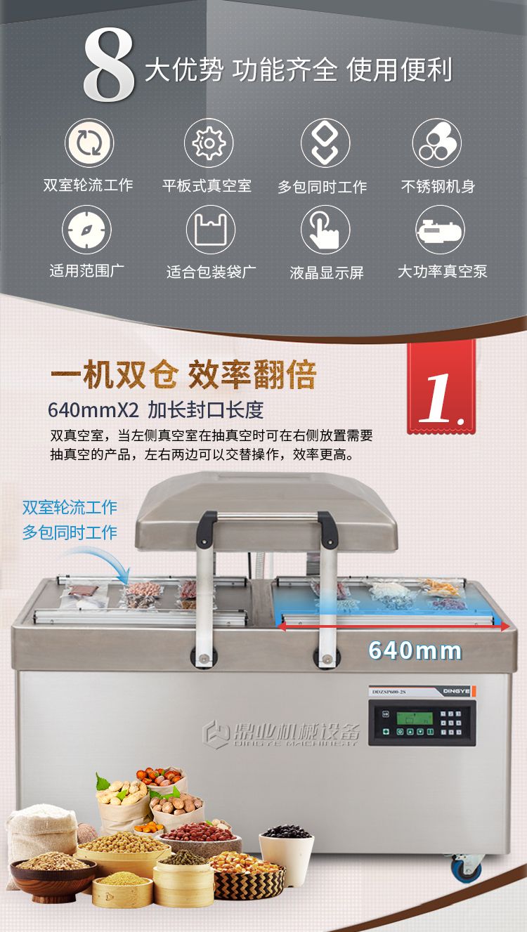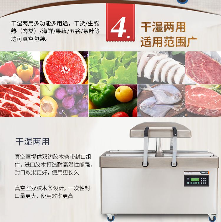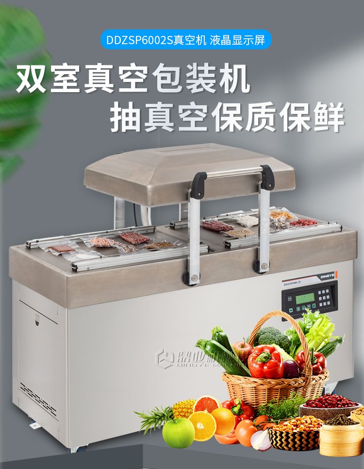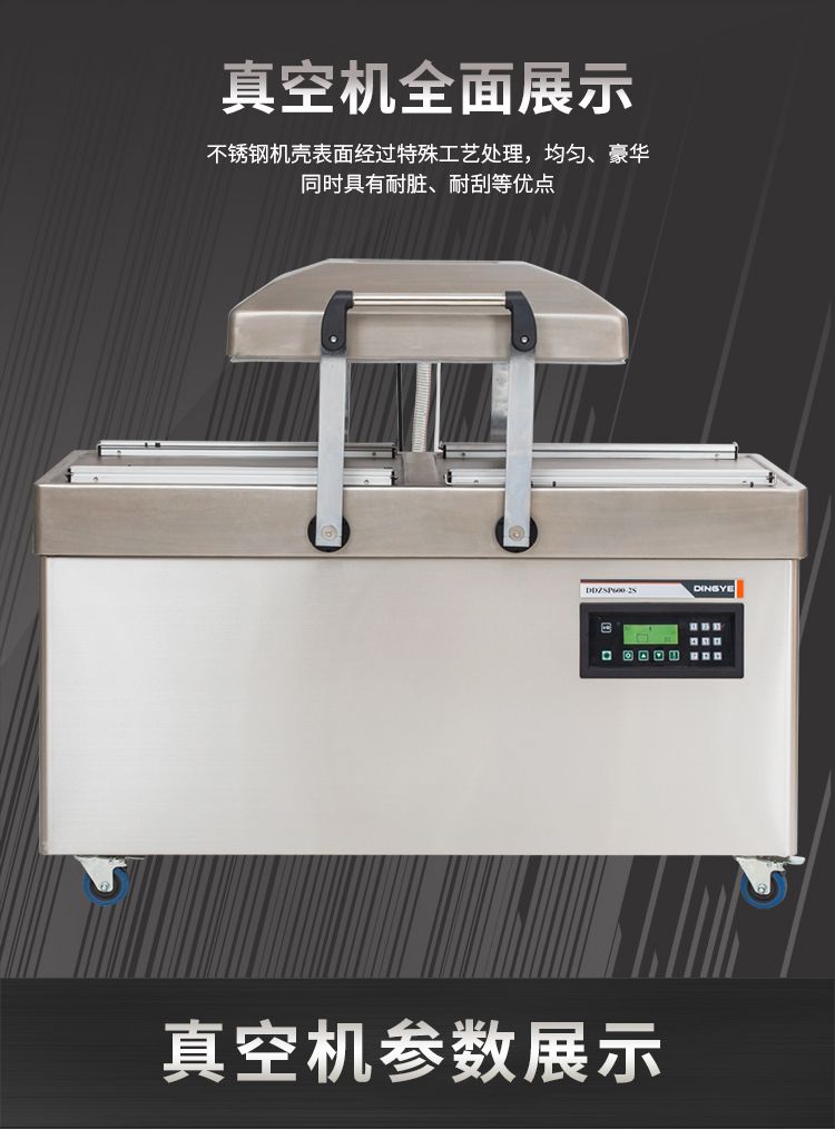 双室真空包装机,抽真空保质保鲜,一机双仓,效率翻倍。双室真空,当左侧真空室在抽真空时,右侧可放置产品来进行操作,左右两边交替操作使用。